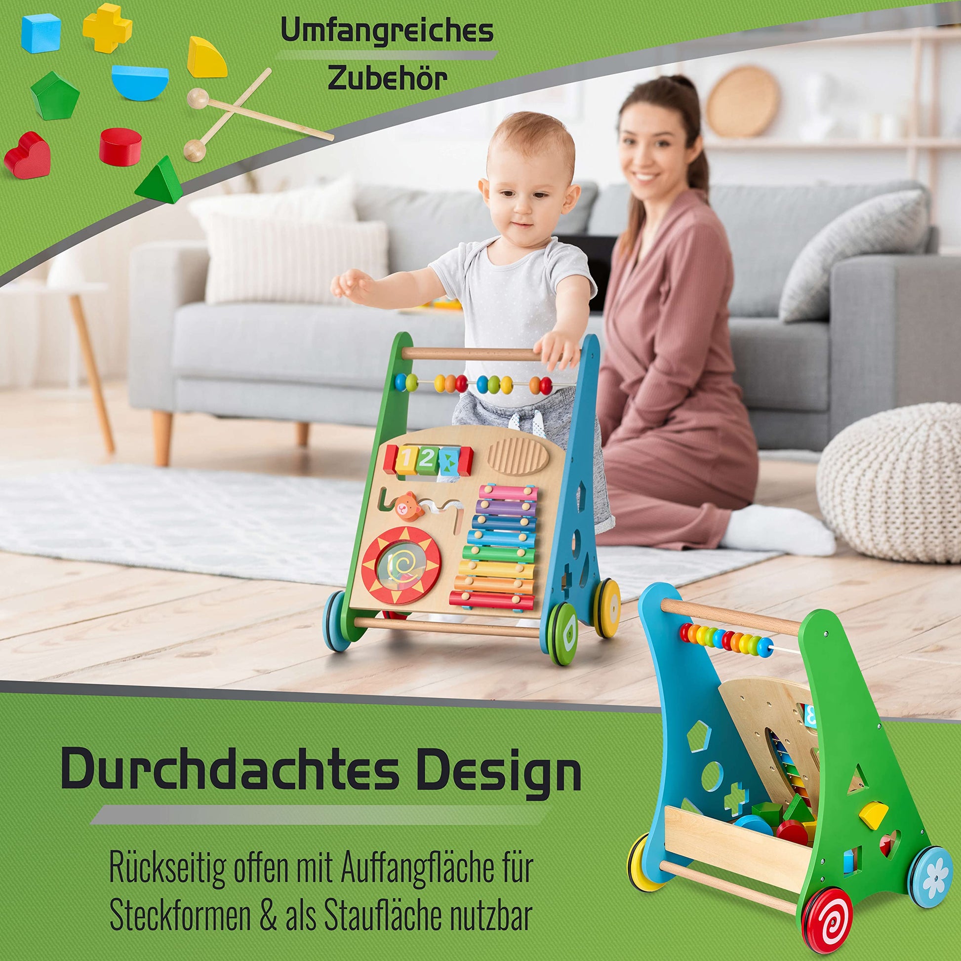 "3-IN-1 GAME & WALKER: The wooden walking aid combines walking support, educational toy, and music station in one - ideal for babies from 6 months old to promote movement, motor skills, and creativity"