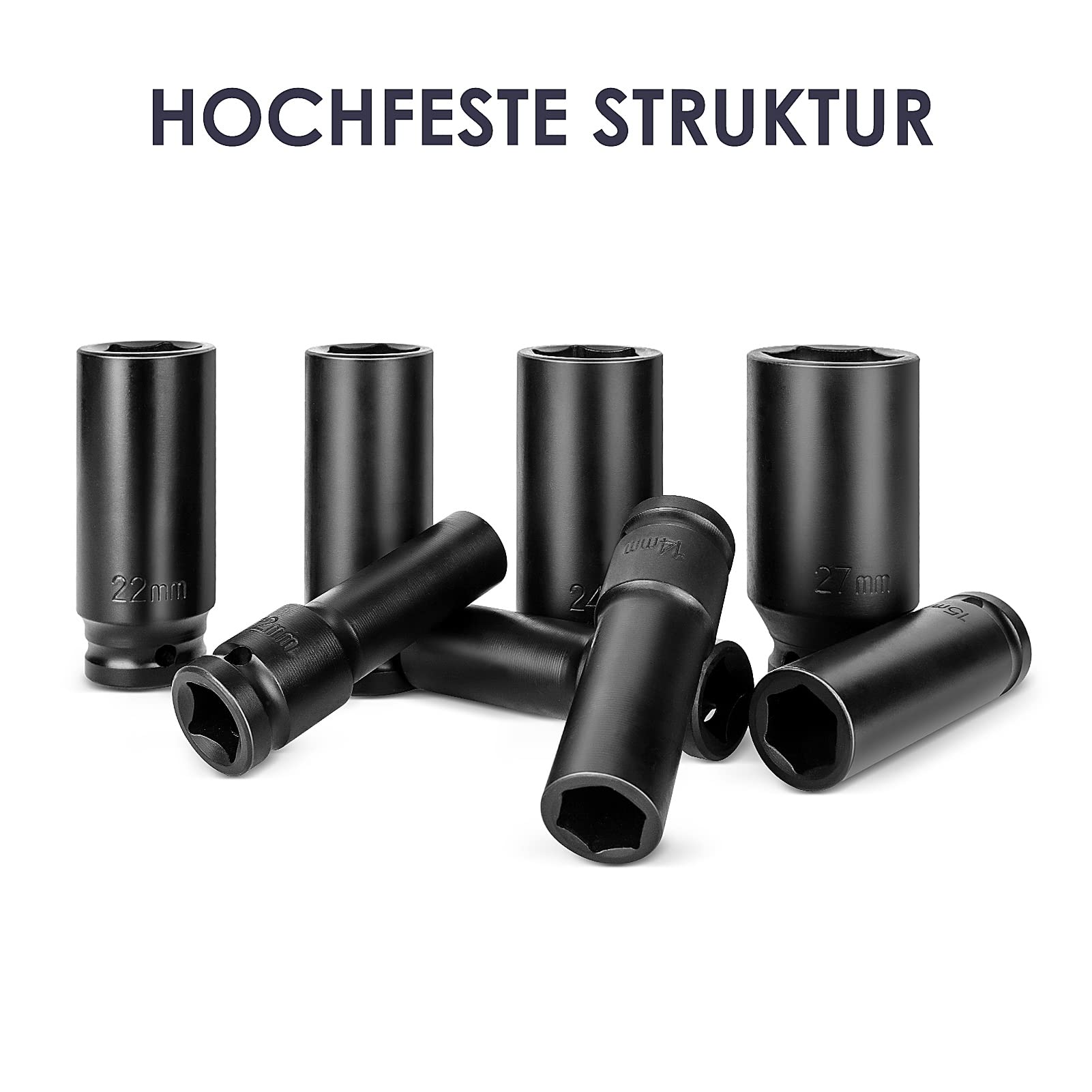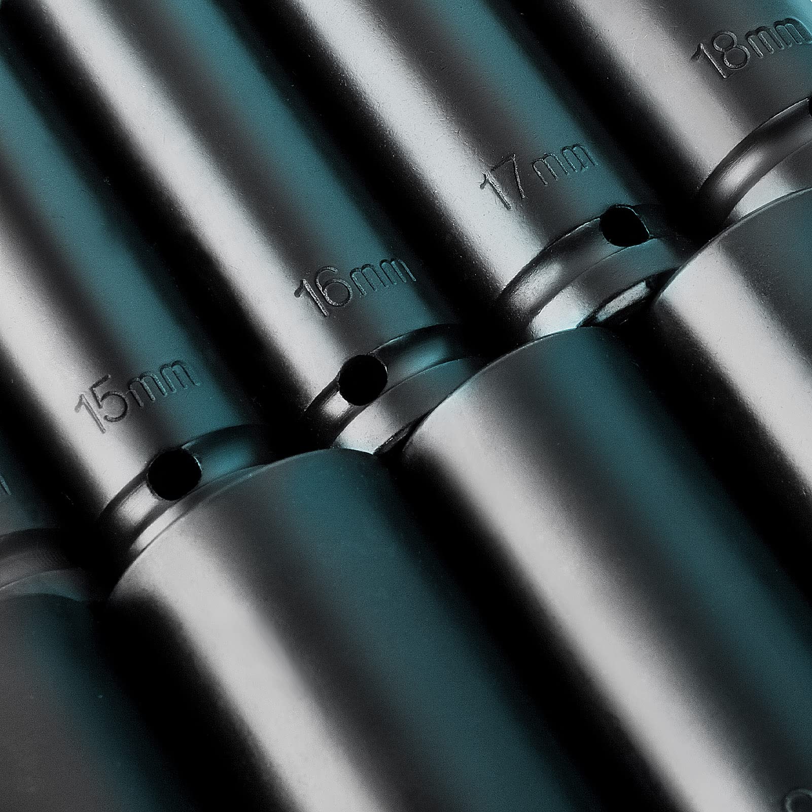 ["Precise Size and Easy to Identify"] 16-piece hex key, 1/2-inch impact driver socket. Each part is carefully measured and processed to ensure accurate dimensions. The size of each socket is printed on the surface, with the size identification large and clear from the packaging. Impact driver nut.