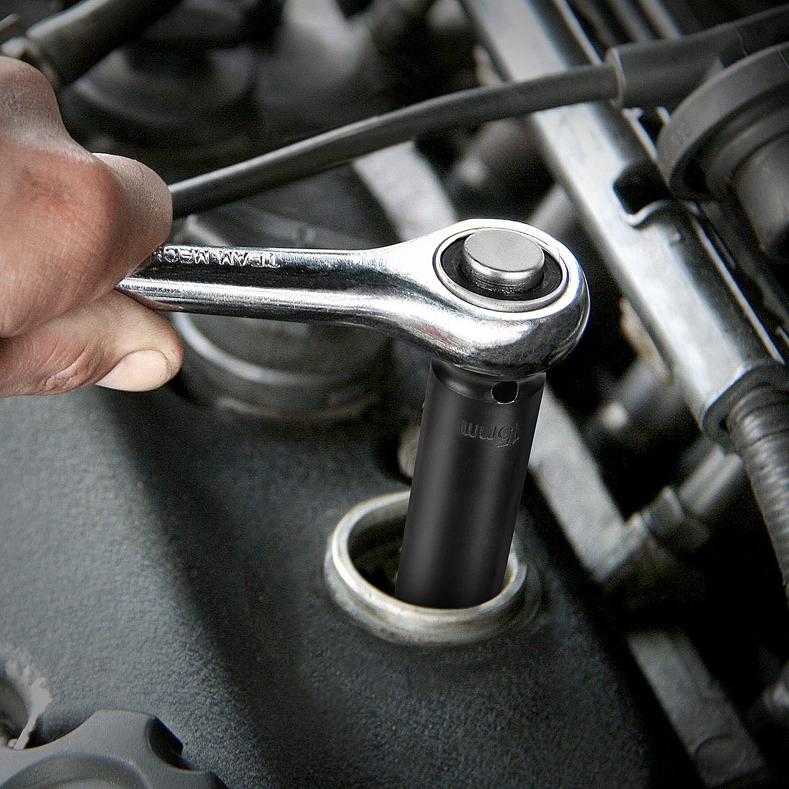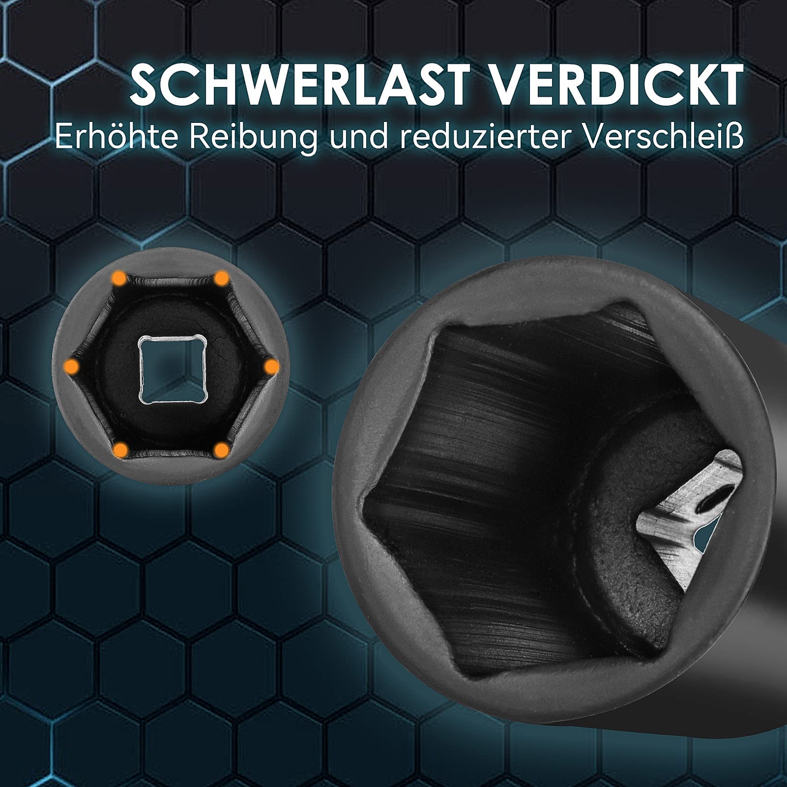 ["Durable Material"] The hexagonal reinforced inner wall design of the socket set increases the contact area between the key and the nut, increases friction, and reduces wear. And heat treated for strength and durability. The finish has a corrosion-resistant black phosphate coating that provides oil and rust resistance.