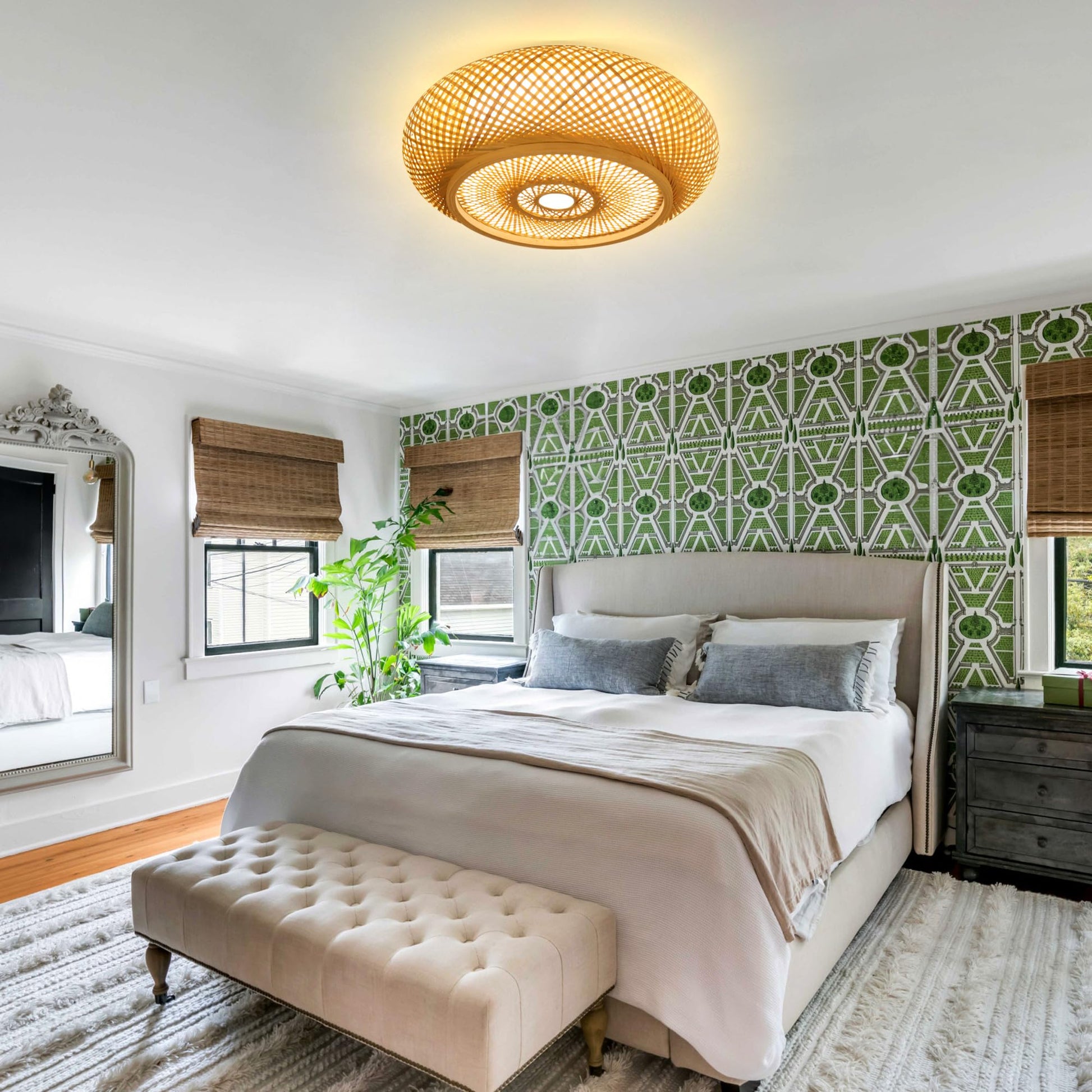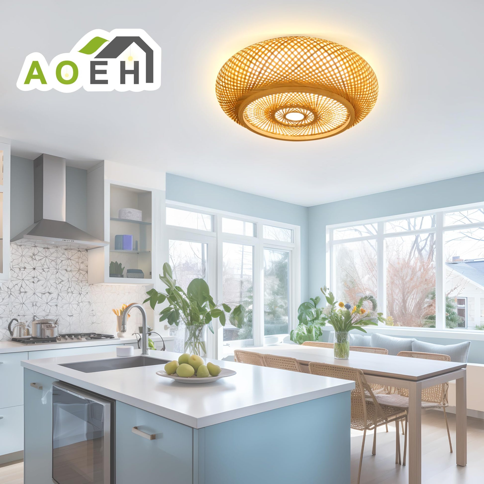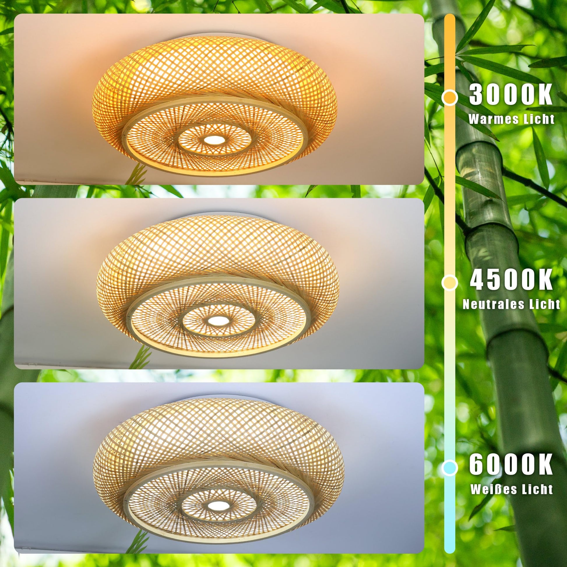 ["Bamboo Ceiling Light: We carefully choose high-quality natural bamboo, peel off the outer skin to make the strips smoother, then cut the bamboo into equal length strips and place it in the sun to dry; finally, a bamboo strip is assembled using techniques such as hand-cross weaving or simple weaving, gradually expanding the area, finally to a round bamboo web artwork rural ceiling light","Product material and size: D40/D50/D60 cm; Power: 40 W/50 W/55 W, Height: 18 cm; Voltage: 220-240 V; Material: natural bamboo + acrylic lampshade; Carefully hand-woven bamboo ceiling light, after drying it is treated with anti-mold and anti-moth treatment to protect the bamboo material. Not only non-toxic, high-temperature resistant, environmentally friendly and healthy, but also extends the life of bamboo ceiling lamps","Stepless dimming with memory: This dimmable ceiling light uses an upgraded version of LED lamp beads, which is more energy-saving and environmentally friendly; as well as adjustable brightness (10%~100%) and steplessly adjustable color temperature (3000K warm light - 4500K natural light -6000K white light) via remote control; In addition, the last light settings can be stored based on the lamp's last use","Wide application The light can not only be used as a ceiling light, but also as a wall light; it can be used for many purposes, making it very suitable for bedrooms, living rooms, study rooms, kitchens, dining rooms, dining tables, farmhouses, recreation rooms, tea rooms; At the same time, our LED ceiling lights have a color rendering index of up to 90, which largely simulates natural light and restores the most realistic colors.","Professional customer service Our package includes installation instructions. The installation is very simple. If you have any questions about the use or installation of the Bohemia Rattan Ceiling Light, please contact our professional team. We will respond within 24 hours to solve the problem for you. If the received package is damaged, please contact us as soon as possible. We will replace you with a new lamp or refund the purchase price"]