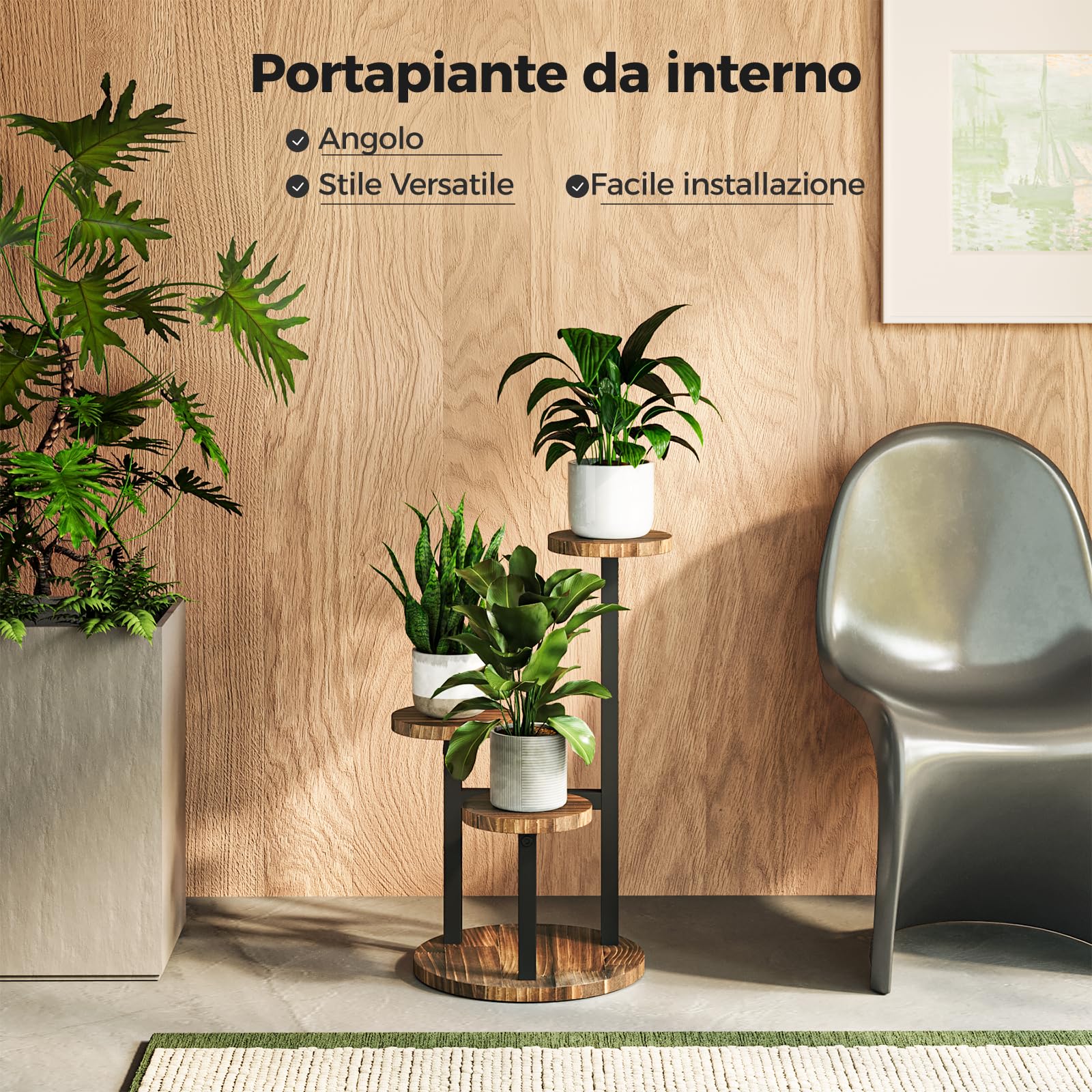 ["Indoor Plant Stand, 3-Tier: Introducing our 3-tier small plant stand - compact yet exquisite. Perfect as a corner plant stand, it adds a touch of nature to any room and enhances the beauty of your beloved indoor plants.","Durability meets style: Made from a fusion of sturdy metal brackets and warm round wooden trays, our plant shelf stands out for its durability and style. The strong combination of wood and metal ensures a solid base for your beloved plants.","Versatile display: Transform your living space with this plant holder. Whether as a decoration for window gardens or balconies, this flower stand enhances home decor in living rooms and bedrooms. Enjoy a stunning display indoors and outdoors.","Multipurpose: Beyond plant stands, our product serves as a multifunctional solution for your lifestyle. Use it indoors to store books, trinkets, collections, crafts, picture frames, and more. It adapts to your needs, offering both practical and aesthetic value.","Perfect gift for plant lovers: Looking for thoughtful garden gifts? Our indoor plant stand is an ideal choice for plant lovers. Give the gift of an elegant green plant display and allow your loved ones to stylishly showcase their plants."]