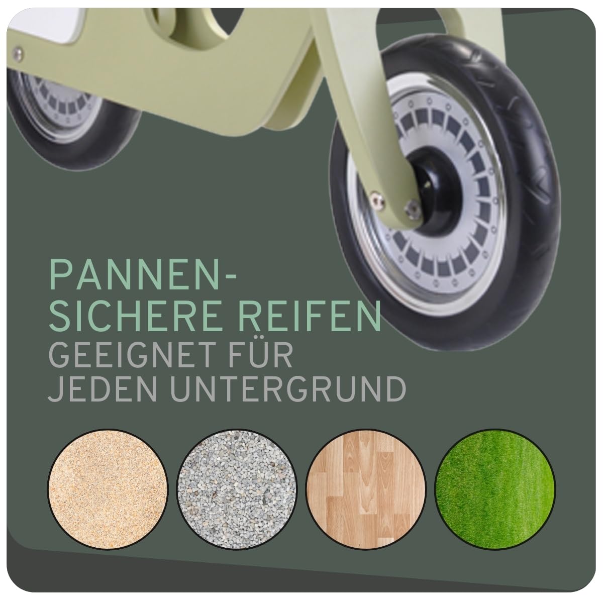 ["ELEGANT RETRO VESPA DESIGN IN GREEN: A stylish wooden balance bike that catches the eye.","ADJUSTABLE SEAT (11.4-15 inches): Grows with your child for long-term use.","QUIET WHEELS: Ensures a peaceful, smooth ride on any surface.","STEERING LIMITER FOR ADDITIONAL STABILITY: Helps children balance safely.","SAFETY HANDLES: Provides optimal grip and comfort for small hands."]