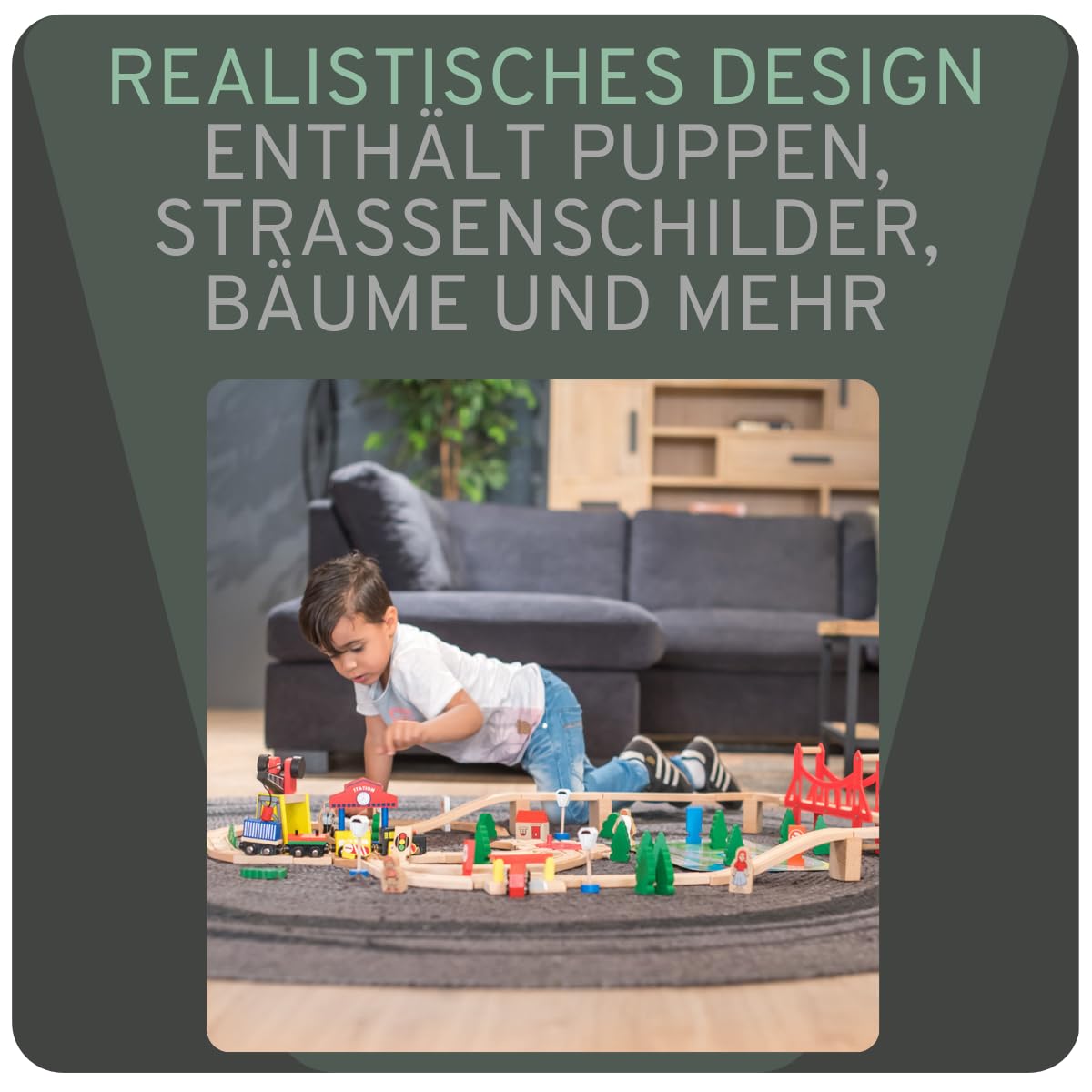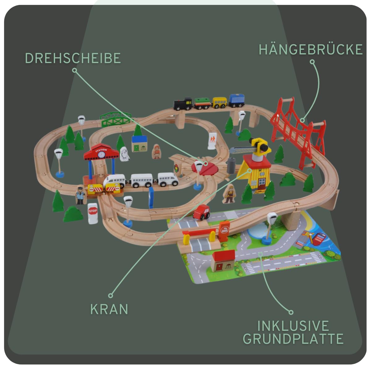 ["100-PIECE WOODEN TRAIN SET: Provides endless possibilities for building and designing your own train tracks.",
