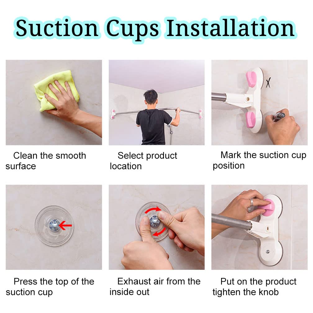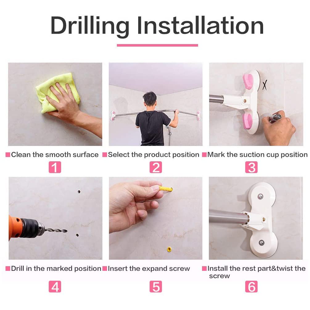 ["MATERIAL: Stainless Steel Composite Pipe / ABS (Arc)","USAGE - Can be used on the corner shelf for your shower curtain","TWO INSTALLATION METHODS: Suction cups or drill hole into wall mount","Steps to install suction cup: Clean and smooth surface ---- Mark position and mount suction cups ---- Scratch from inside to outside, release air and ensure suction cup is present. Then follow the steps to install the product. If you have any problem, feel free to contact us.","DURABLE: Strong suction cup, not afraid of water"]