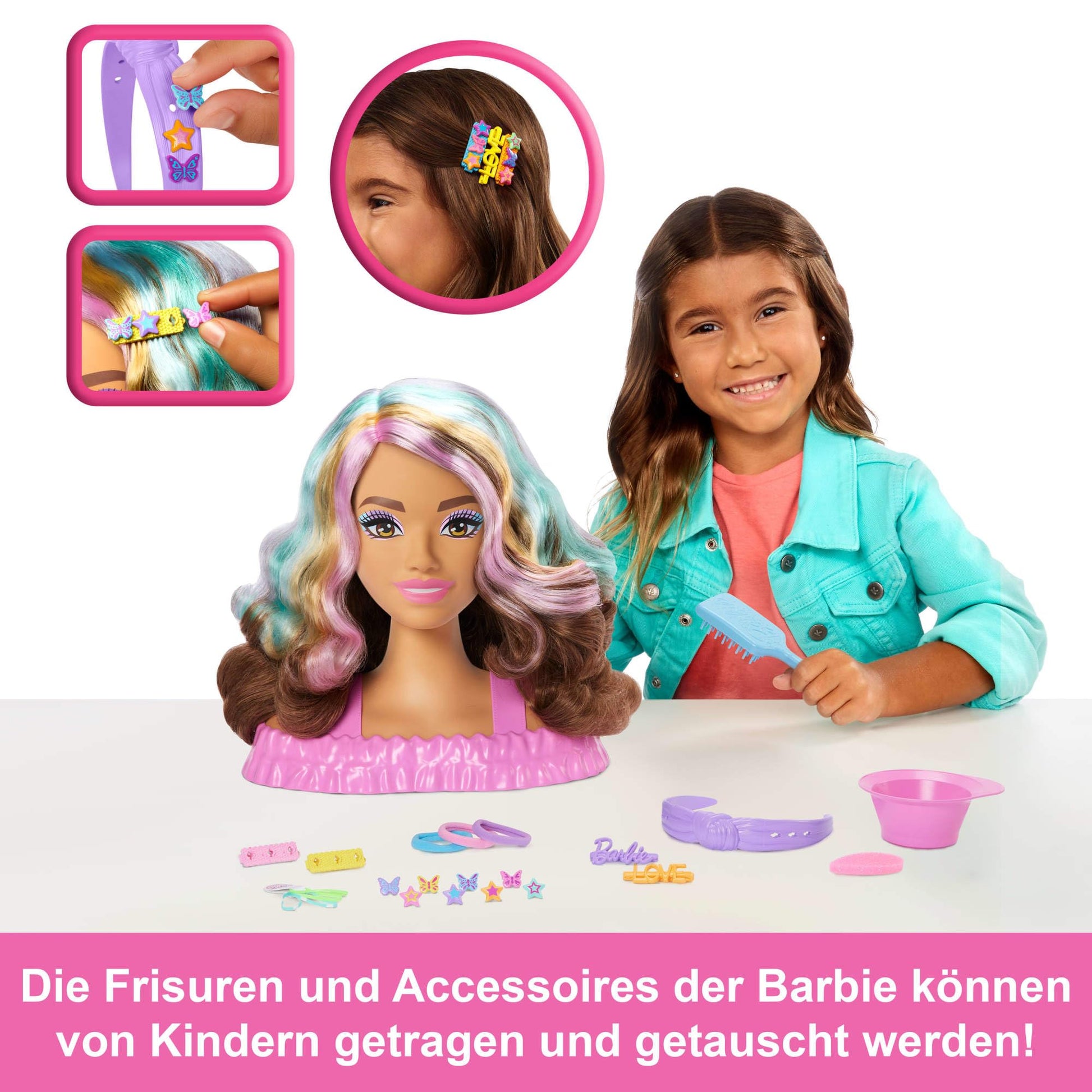 Barbie Styling Head with dark brown hair comes with over 20 styling accessories including stars, butterflies, and color-changing hair clips, JFG82.