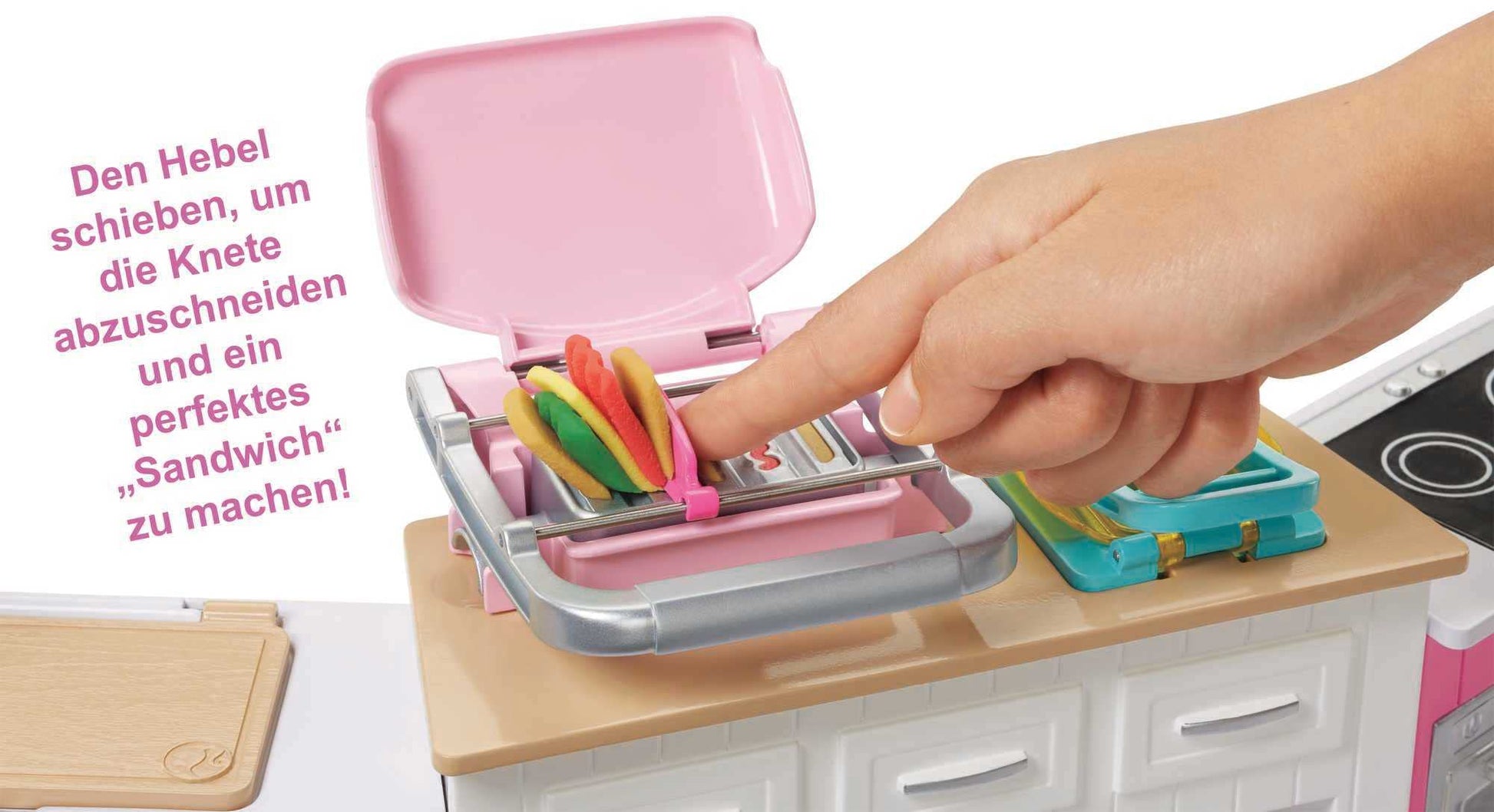 ["The Barbie doll shows young gourmets how much fun cooking can be in the Deluxe Kitchen playset, which includes lights and sounds, vegetable molds, clay in 5 colors, and more than 20 accessories, offering numerous opportunities for creative role play.",