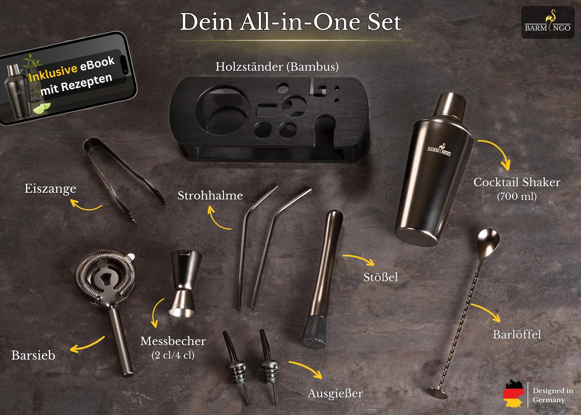 ["✅ 11 PIECES: Our cocktail set includes the essential cocktail accessories: Cocktail shaker, jigger, muddler, ice tongs, spoon, strainer, 2 pourers, 2 straws, stand, and cocktail eBook","✅ DESIGNED IN GERMANY: You value a chic and high-quality design? Our bar set was optimally tailored to the needs of our customers by German engineers - highest quality standards meet modern color combinations","✅ UNIQUE SHAKER: Tired of leaky and easily jammed cocktail shakers? Our cocktail mixer impresses with 100% functionality - leaks and jams are a thing of the past","✅ SUPPORT YOUNG START-UPS: Interested in innovative products? Then you're in the right place with us! We are a company founded in 2021 in southern Germany","✅ 100% SATISFACTION: BARMINGO stands for highest quality and reliability. If you are still unsatisfied, we offer you a 30-day money-back guarantee on our bartender set"]