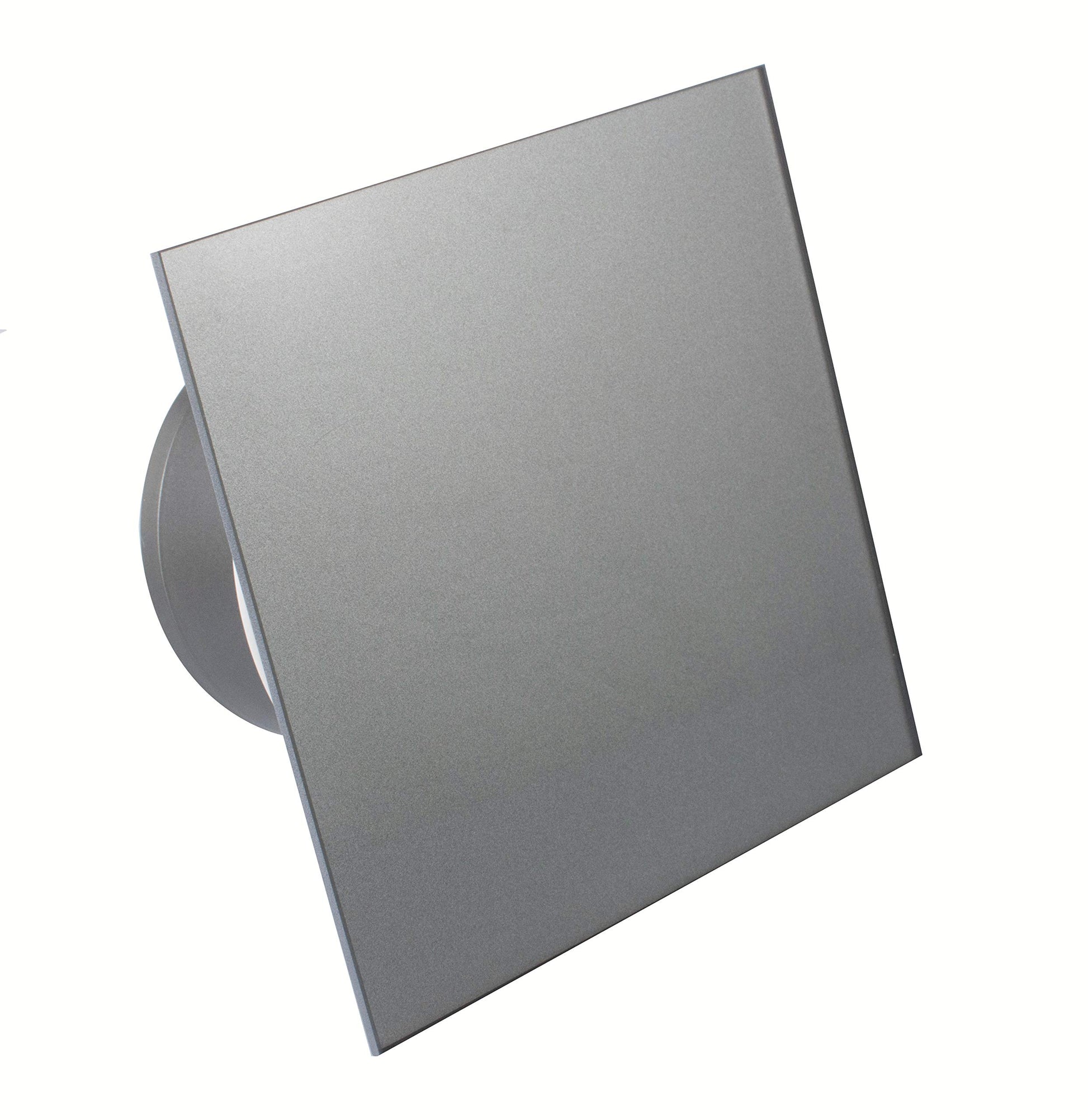 Bathroom fan with integrated backdraft damper, glass front, powerful 105 m³/h, very quiet 39 dB, ball bearings, made in EU. Available in white or silver (105 m³/h).