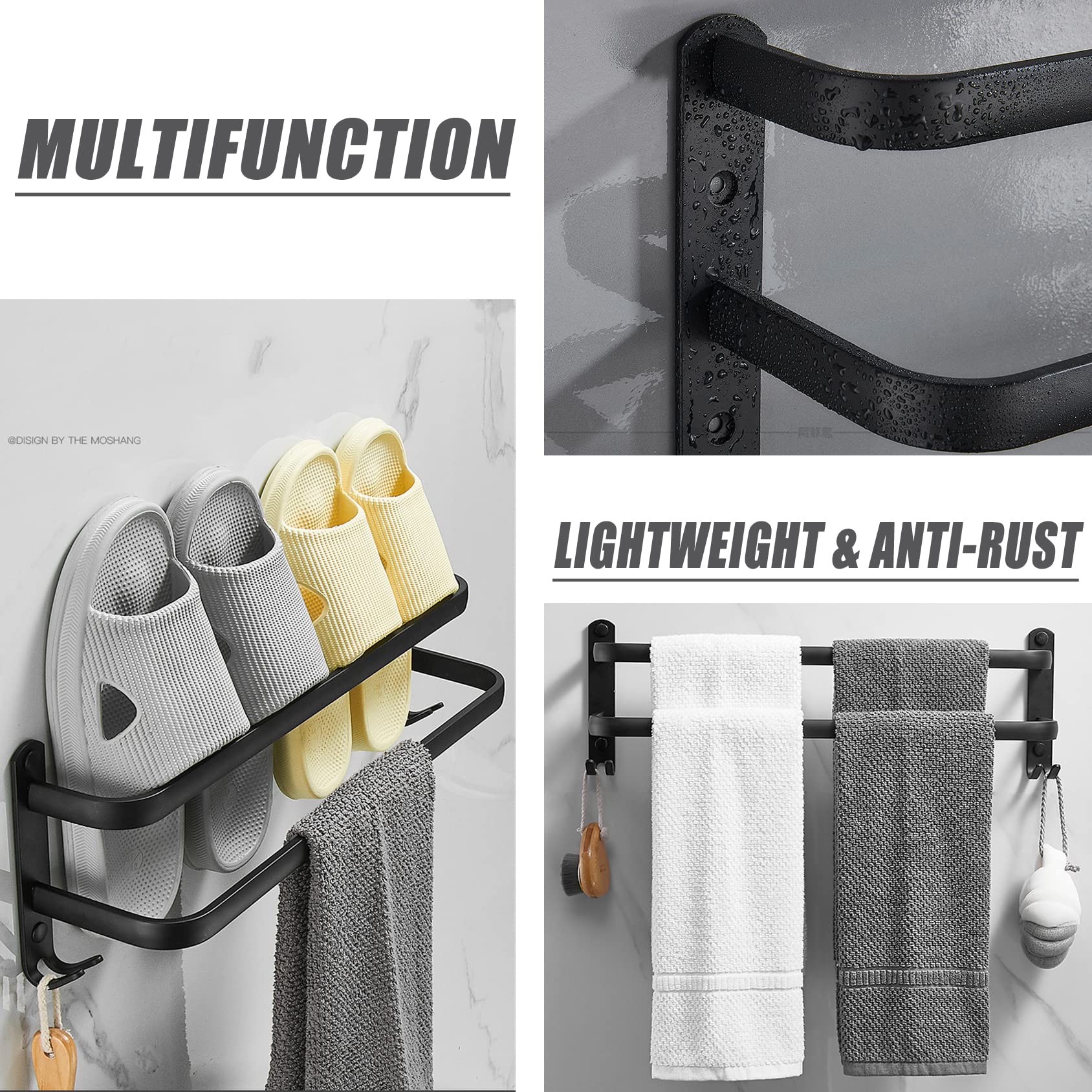 ["The towel rack is made of high-strength aluminum alloy that is non-rusting, lightweight, corrosion-resistant, and durable.","Towel holder with hook design, the matte black surface can be combined with a variety of interior styles, saving more space and making your bathroom look fresher.","Two installation methods: adhesive and screw mounting, both methods are very stable. If you don't want to damage the wall, install it with adhesive. Adhesive Name: Nail-free glue.","Our high-quality towel rack features a special stepped frame that makes it more convenient for you to take towels and allow towels to dry faster.","This modern-looking towel rack, suitable for bathroom, kitchen, and bedroom, is an excellent alternative to wall hooks. The wall-mounted design saves space, beautiful, practical, and keeps the room clean."]