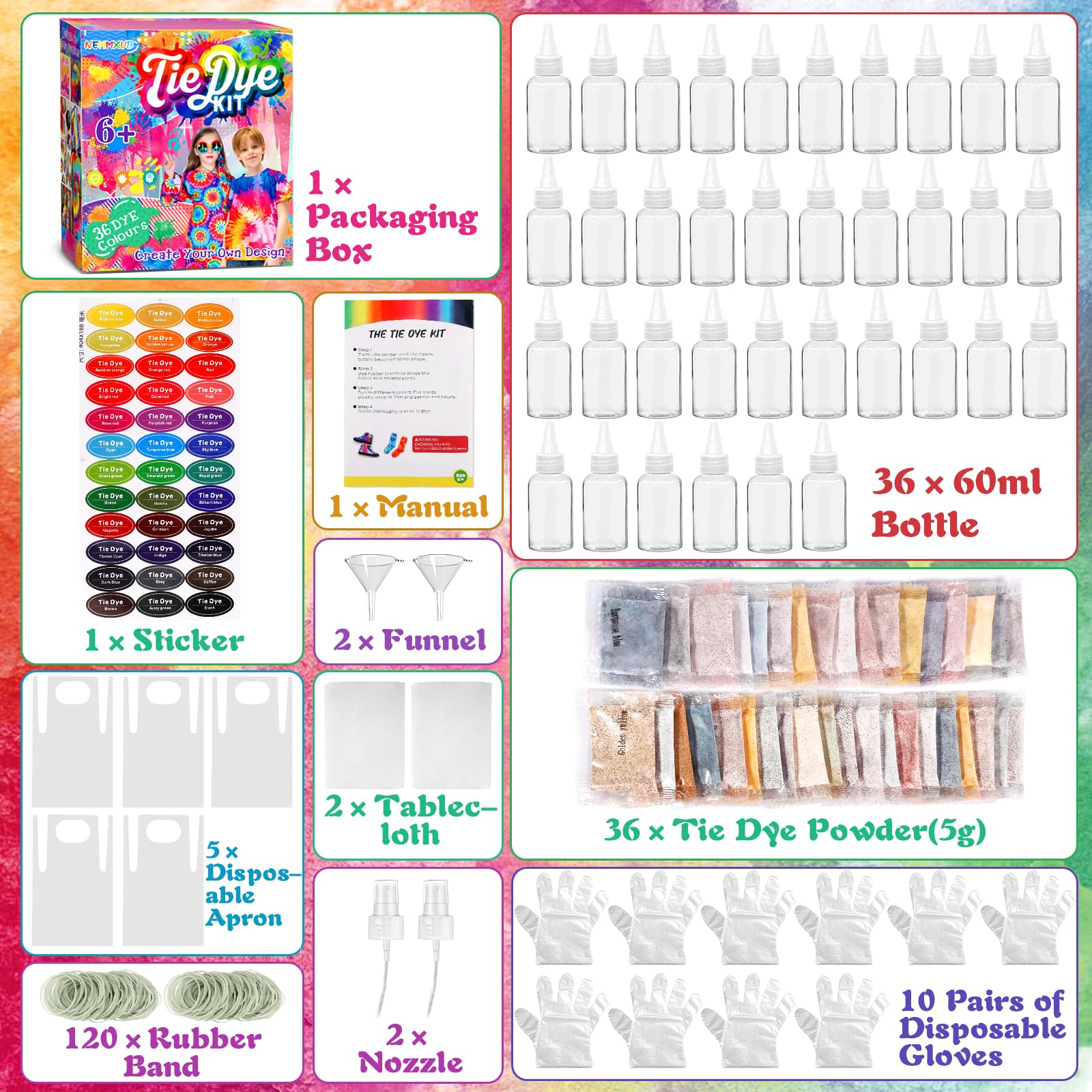 ["🌈【10-In-1 Tie Dye Kit】- The VIPNAJI Tie Dye Kit includes 36 * colorful dyes, 36 * 60ml squeeze bottles, 120 * rubber bands, 10 * pairs of gloves, 5 * aprons, 2 * table covers, 2 * funnels, 2 * spray nozzles, 36 color stickers, 1 * manual. This complete batik set brings you endless fun while keeping your hands, clothes, and table clean, making it an essential set for your DIY art.","👚【High-Quality Dyes】- The dyes are permanent and colorfast, so they won't fade when washed. Since the dyes are mixable, you can create your own custom colors.","✨【100% Safe for Kids】- Fully certified complete set made of high-quality, safe, and non-toxic materials. The dye is easily soluble in water, non-toxic, tasteless, extremely environmentally friendly, and safe for children.","👗【Easy to Use】- It's a one-step process, just add water. Includes step-by-step instructions with over 36 colors to choose from.","👟【Wide Applications】- Fun batik sets provide hours of screen-free playtime! They also encourage kids to be creative. A batik set for kids is a great family activity. You can enjoy the colorful DIY batik world together with your children and create personalized batik t-shirts, hats, bags, socks, and even canvas sneakers."]