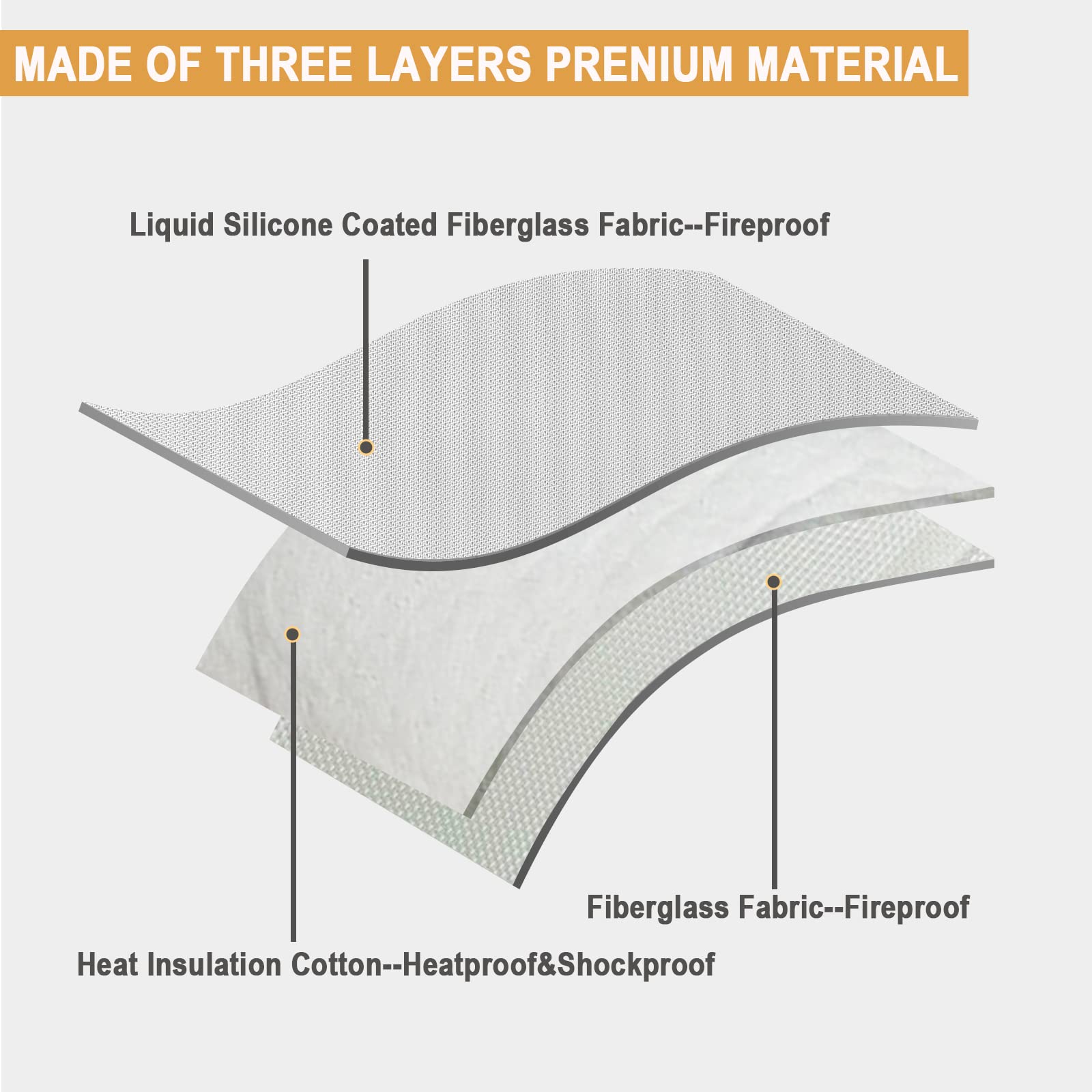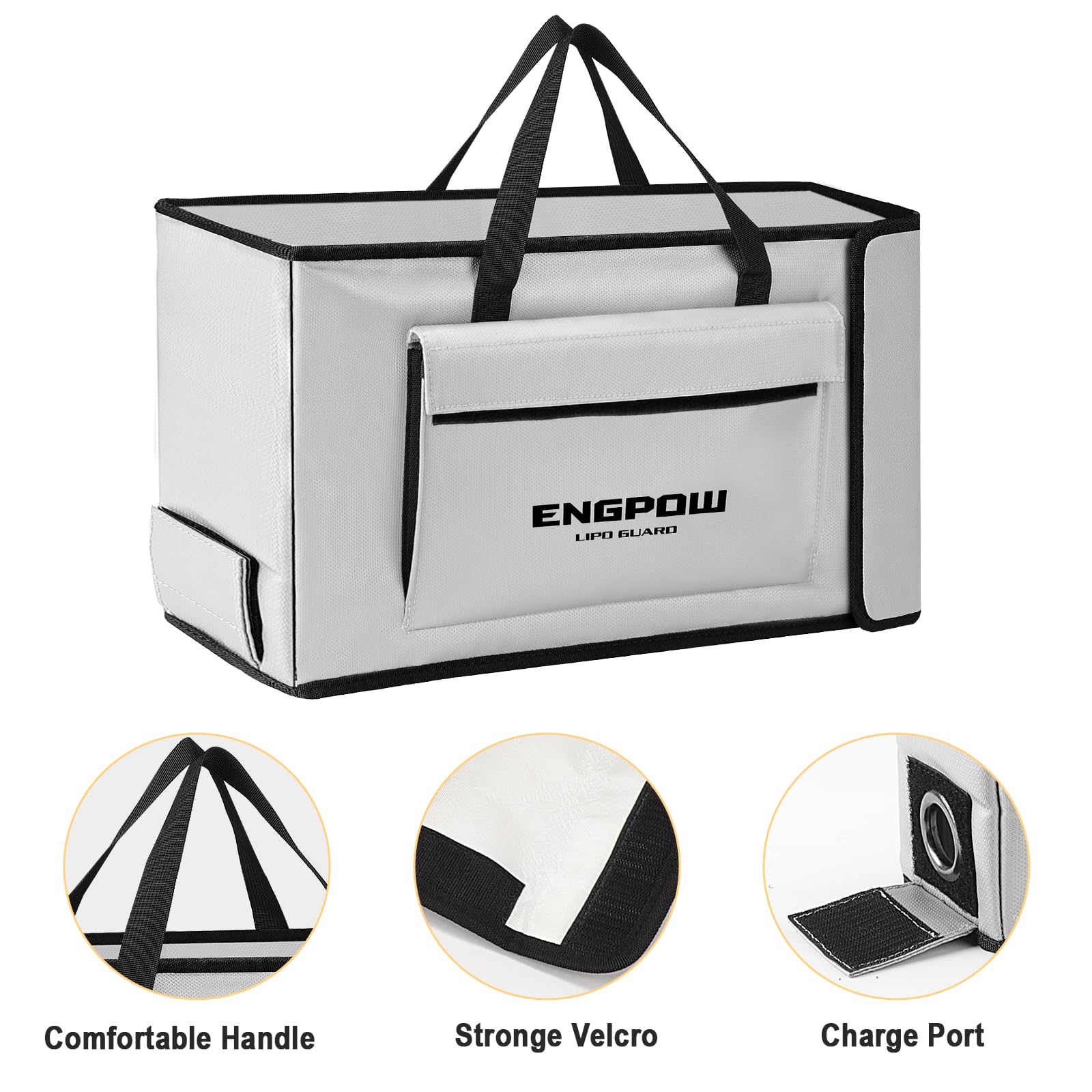 ["Fireproof Lipo Bag"] The lipo battery bag is made of three-layer materials, including fiberglass fabric, heat-insulating cotton, and liquid silicone-coated fiberglass fabric, which is fireproof and can withstand high temperatures of up to 2000°F and is tested by SGS (UL94 VTM-0 certified). Additionally, it is also waterproof and resistant to splashing water, preventing water droplets from getting inside.