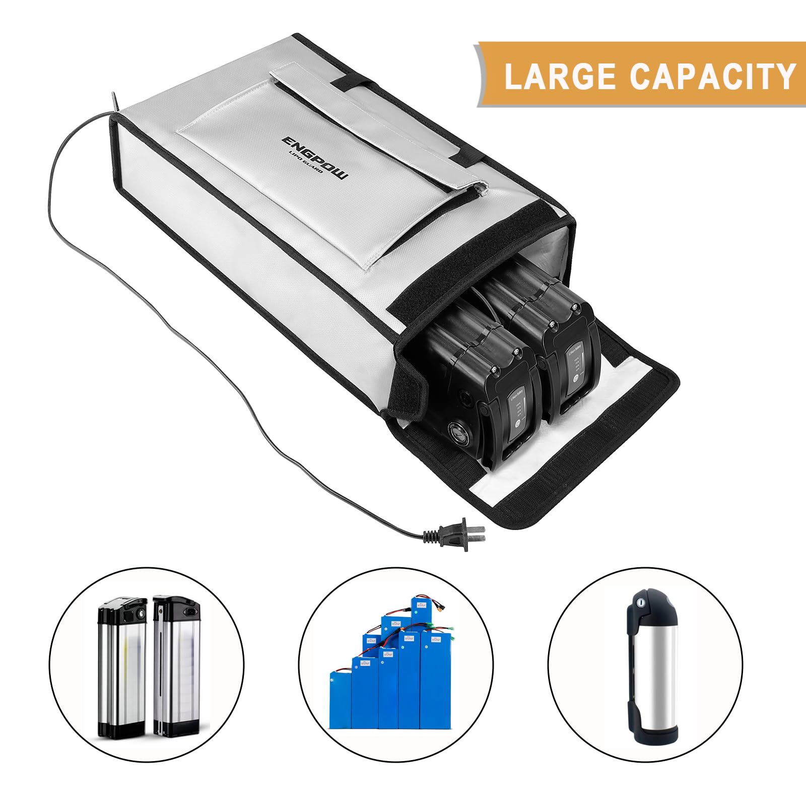 ["Large Battery Bag"] Upgraded in size to 45 x 12 x 25 cm, there is ample space to store and easily remove both e-bike batteries or drone batteries. The outside has a small pocket available for the battery charger and cable.