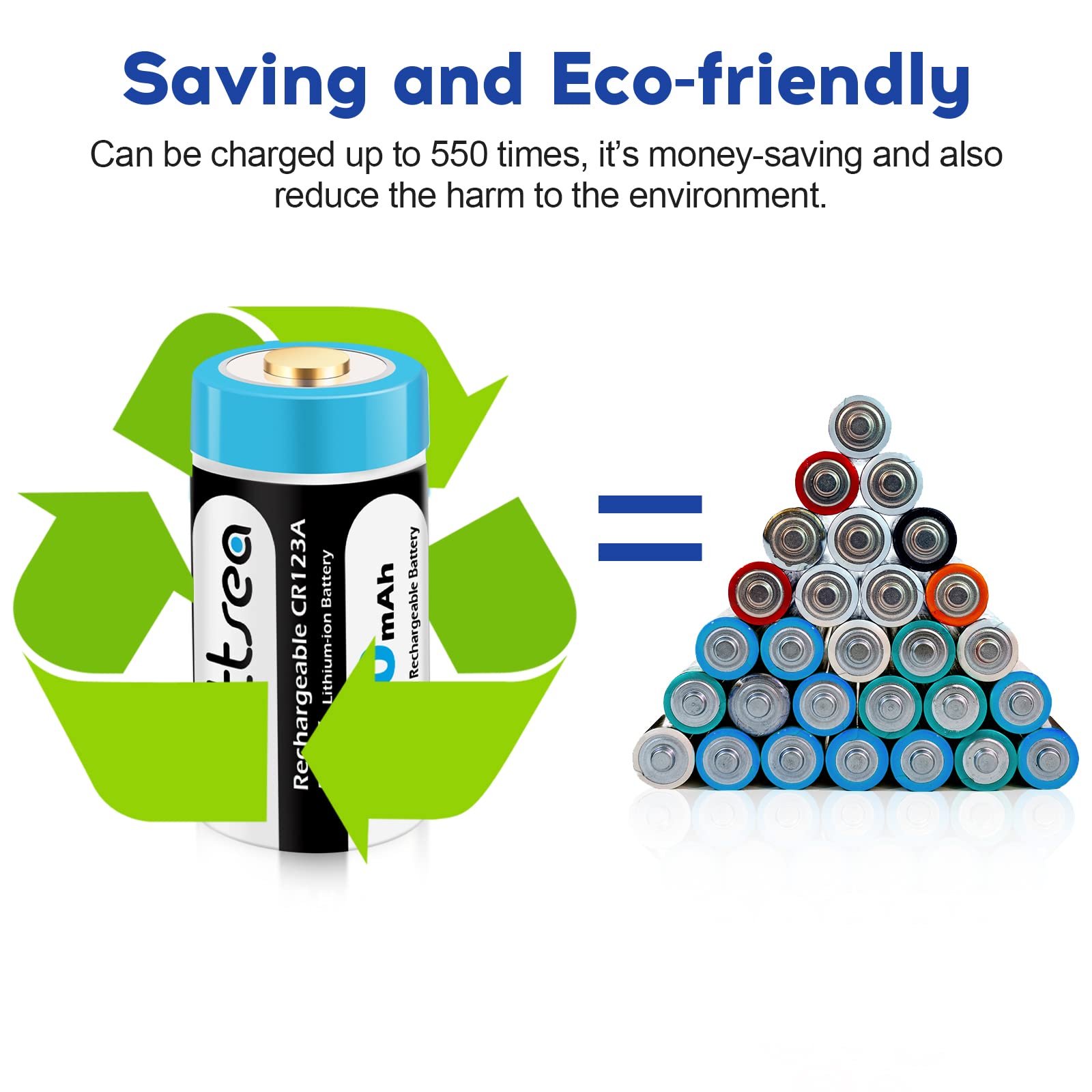 ["+25% Longer Lasting: With advanced optimization technology, Battsea 750mAh rechargeable lithium batteries last 25% longer than competing batteries and charge up to 550 times","Premium Charger: 5V/2A quick charge input, Battsea 4-channel battery charger only takes two hours to fully charge 4pcs Compatible with Arlo rechargeable batteries, providing uninterrupted power to frequently used devices like Compatible with Arlo cameras, flashlights, smoke detectors, smart sensor, and more","Secure Charging: Premium battery with overcharge, over-discharge, and overcurrent protection","Compact Design: Battsea 3.7V Battery Size: 1.35in x 0.65in (34.2mm x 16.5mm), a great choice to replace non-rechargeable battery models: 123, 123A, CR123R, CR17335, CR17345, DL123A, EL123AP, K123, K123A, K123LA, L123A, SF123A, VL123A","Quality Control: all products have passed strict quality control"]