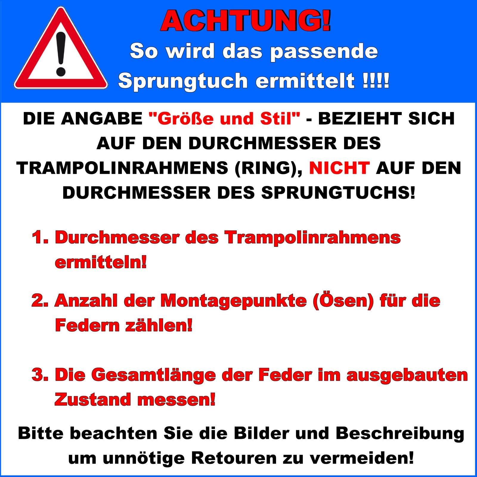 "Trampoline Safety Pad Cover for Trampolines with Ø 14 – 14.1 feet and 88 eyelets for attaching 5.7 inch springs. (The total length of the spring, including the hook, is measured when extended!)