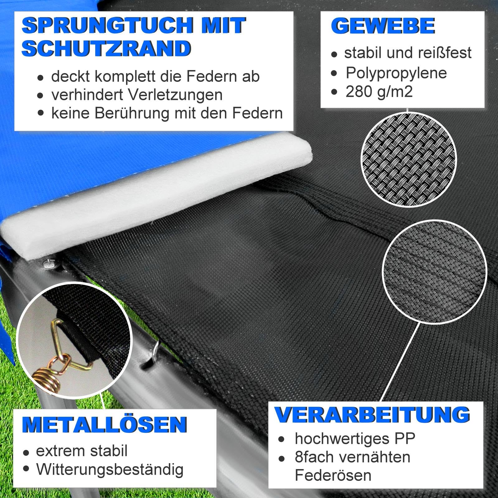 Maximum Safety: Protective padding prevents contact with springs and minimizes the risk of injury. Optimal Stability: Reinforced stainless steel metal eyelets, 8-fold stitched, ensure secure and durable attachment.