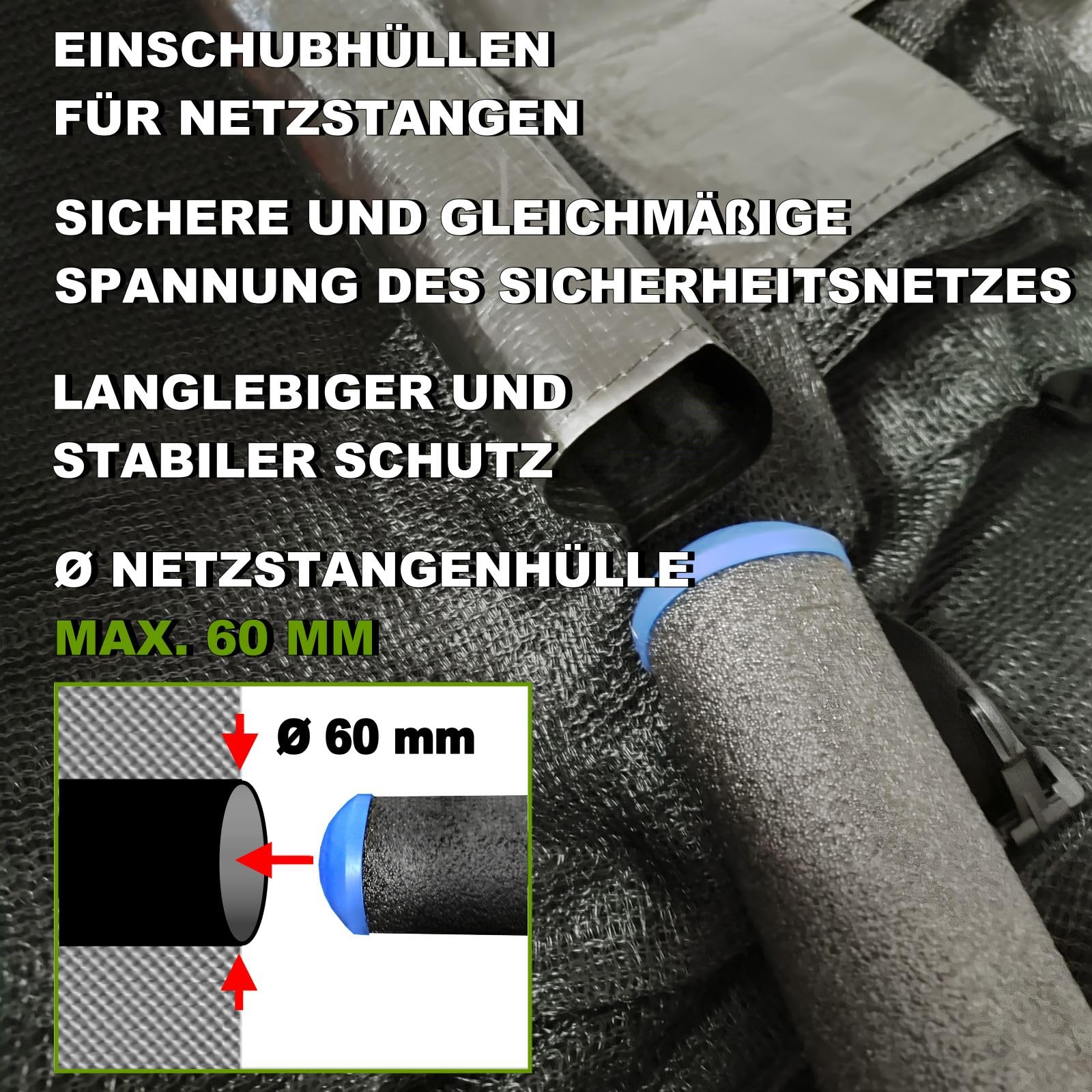 "Trampoline safety net size Ø 427 - 430 cm, suitable for 6 poles, height 180 cm, with centrally positioned zipper. Compatible with trampolines with external nets. It is stretched over the frame of the trampoline and securely fastened with stretch bands and hooks to keep it in place even during intense use. The zipper in the center allows easy access. Easy to assemble, durable, and provides optimal protection. Check carefully for dimensions and compatibility before purchasing."