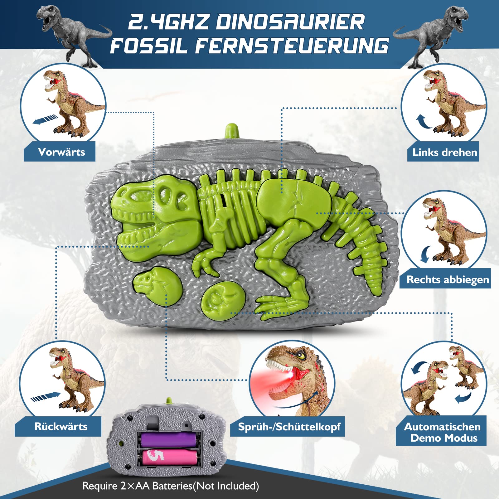 ["Multifunctional Remote Controlled Dinosaur - This dinosaur toy can move forward and backward, turn right and left, shake its head, spray mist, rotate 360 degrees like real dinosaurs. In addition, the T Rex with cool lights on its back and mouth, realistic roars will bring endless fun to your kids and draw their attention away from reducing screen time.",