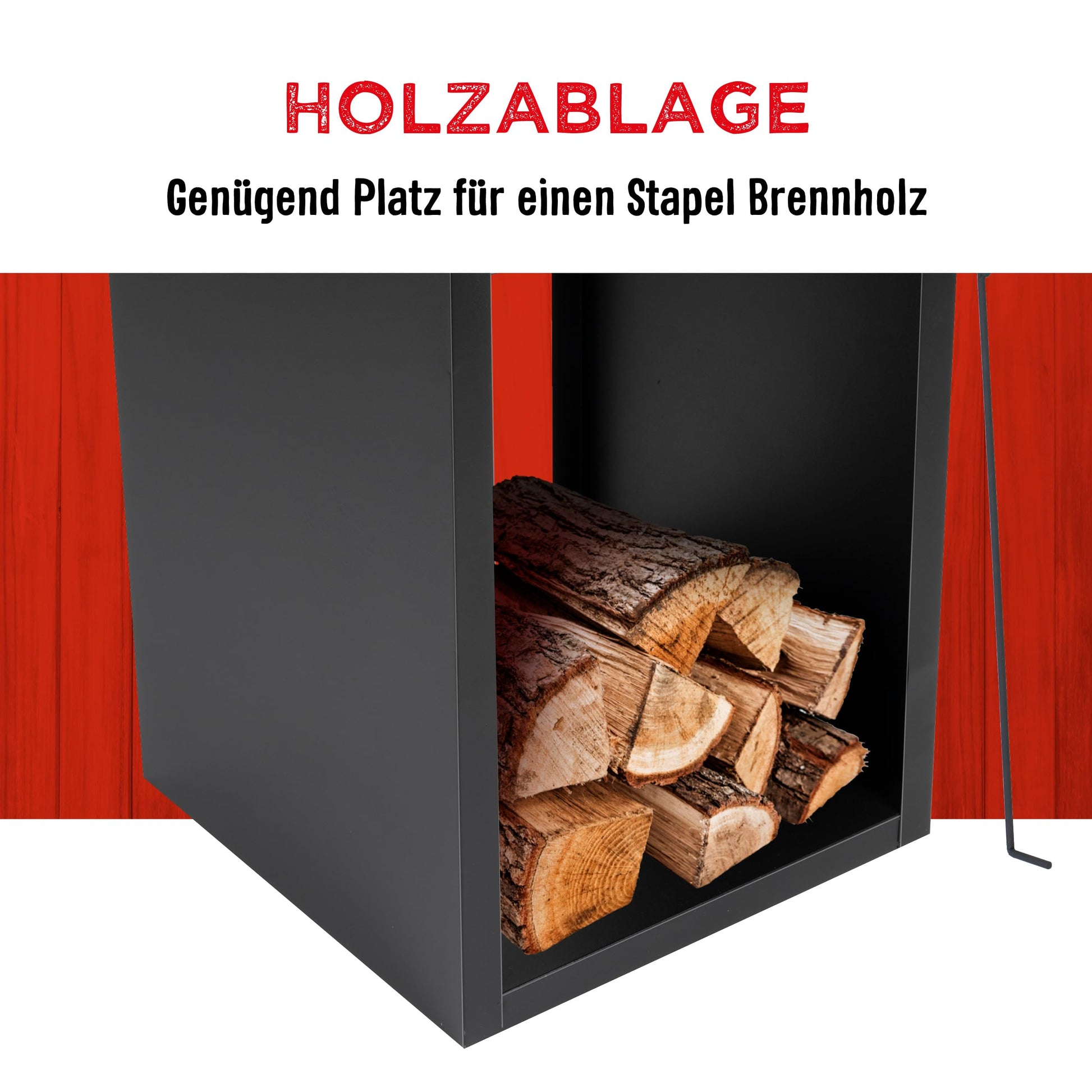 ["FIRE PIT WITH SPARK SCREEN: The spark screen of the fire basket ensures that sparks do not escape from the fire. The holes in the protective grid allow for a better view of the fire.","STURDY FIRE PIT: Thanks to the carbon steel material, you can use this garden fireplace perfectly outdoors. However, make sure not to leave it unprotected outside in the rain.","PATIO FIRE PIT WITH WOOD STORAGE: You don't have to go far for wood with this fire pit. The patio fireplace has a built-in wood storage area.","PATIO HEATER WITH FIRE POKER: This cozy patio heater comes with a fire poker, allowing you to move and stoke the fire from a safe distance.","MODERN DESIGN: The garden stove is finished with black heat-resistant paint. Combined with its unique shape, this gives the fire pit a modern look."]