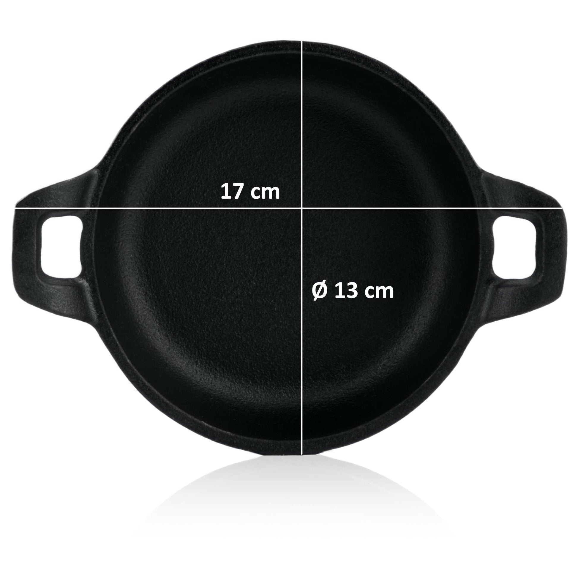 "TECHNICAL DATA | External dimensions: (W) 17 x (D) 13 x (H) 3.5 cm | Diameter: Ø 13 cm | Number of pots: 6 | Weight: 3.35 kg | Capacity: 10.14 fl oz | Material: Cast iron, pre-seasoned"]