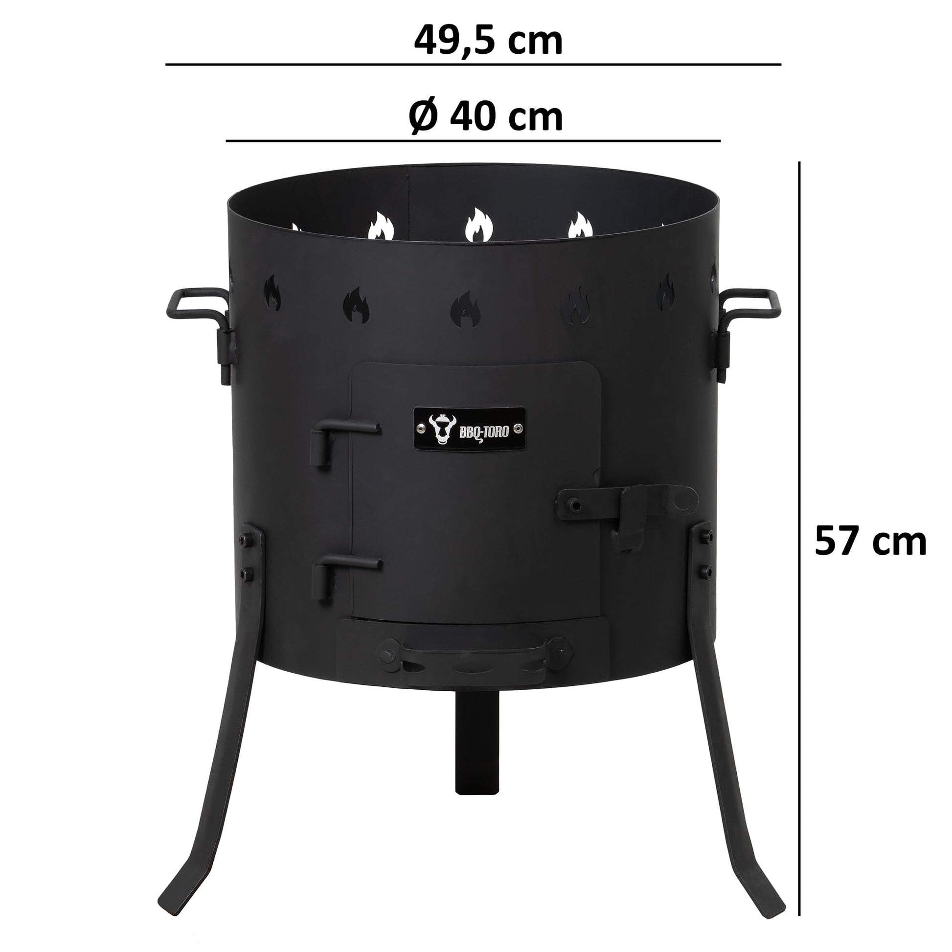 ["VERSATILE | The BBQ-Toro Kazan fits perfectly into the Kazan oven, allowing it to be used not only as a fire pit, but also as a versatile grill or cooking area. Additionally, the Kazan can also be used on a fire barrel, a rocket stove, or a charcoal grill with the appropriate attachment.","THE PRINCIPLE | Thanks to its high mass (cast iron), the Kazan regulates uneven heat and allows for even cooking. Dishes such as the typical Russian rice dish Plov, a Uha (fish soup), and much more can be easily prepared in the cast pot.","USAGE | The fire pit is not only suitable for using a Kazan, but also provides space for Dutch ovens, woks, pans, and pots. Thanks to its three stable legs, the Utschak can be placed on almost any surface.","FIRING UP | The garden oven can be fired up with wood or charcoal. With its generous cooking surface, you can easily cook, roast, stew, fry, simmer, or bake your favorite dishes in the Kazan.","PRACTICAL | The Kazan oven is equipped with two side handles for safe and comfortable carrying. Additionally, the oven has a convenient slider on the door for secure locking."]