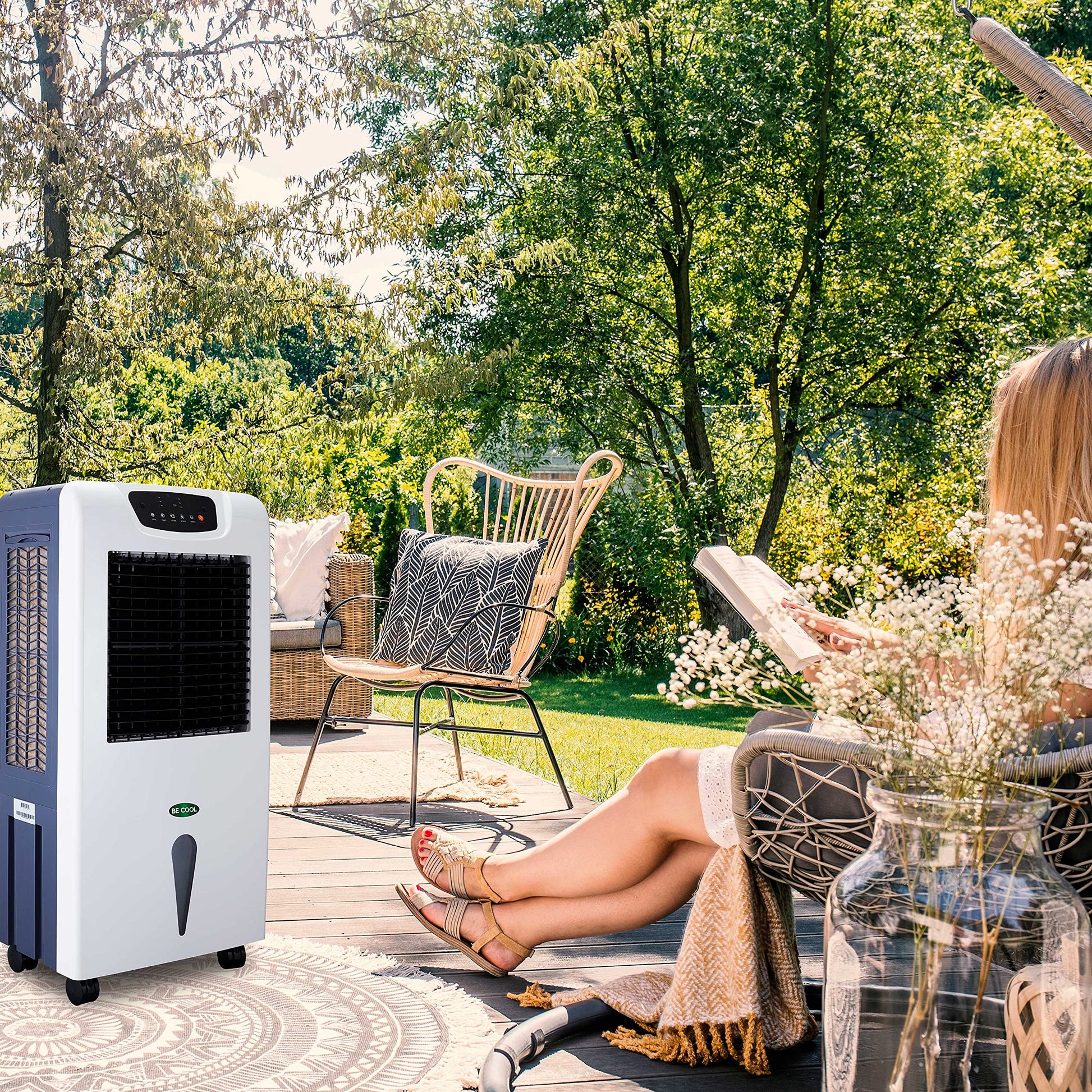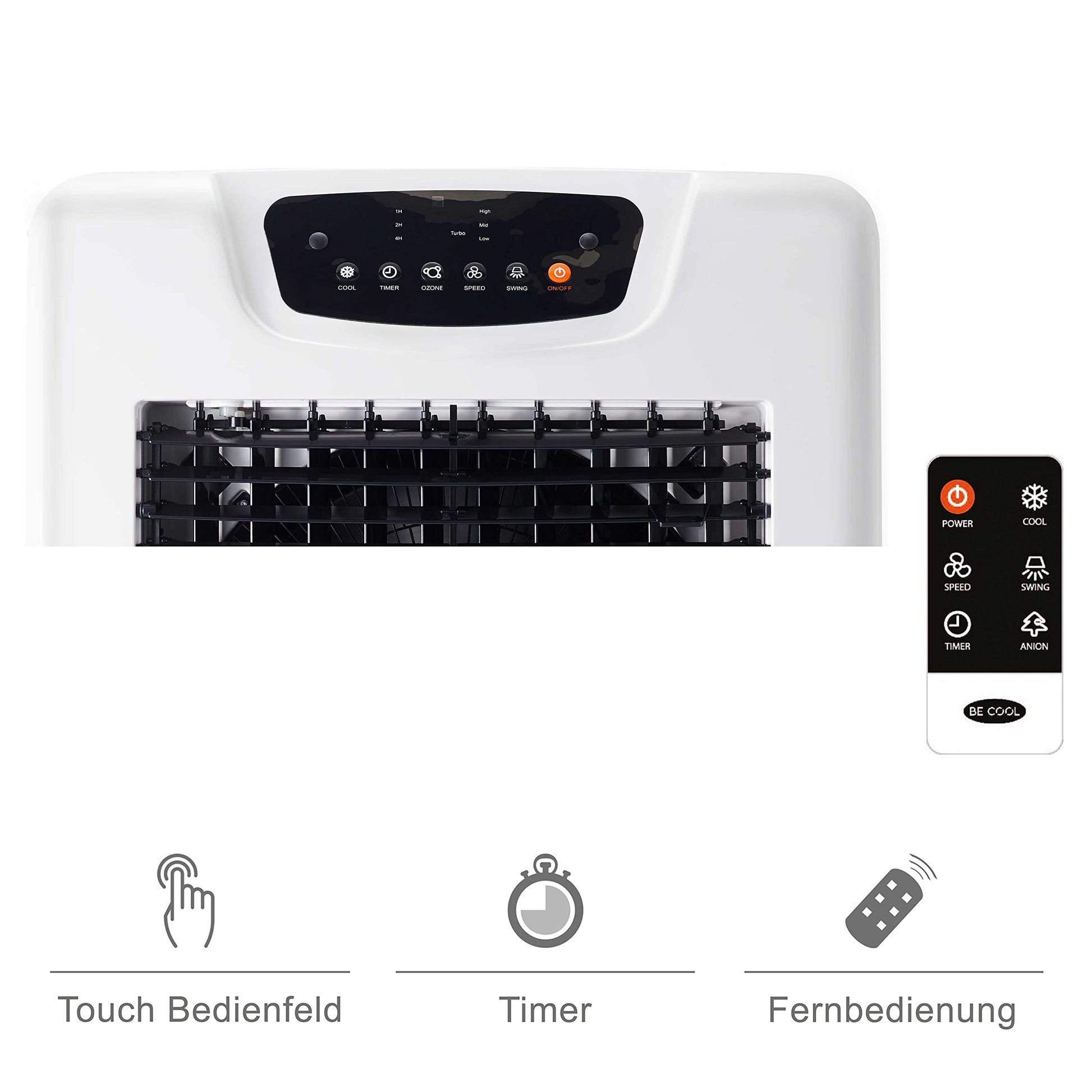 BE COOL air cooler with water cooling, 3-in-1 evaporative cooler, humidifier, fan, oscillation function, air purifier with ionizer, 4 speeds, 63 liter water tank, timer, white/gray.