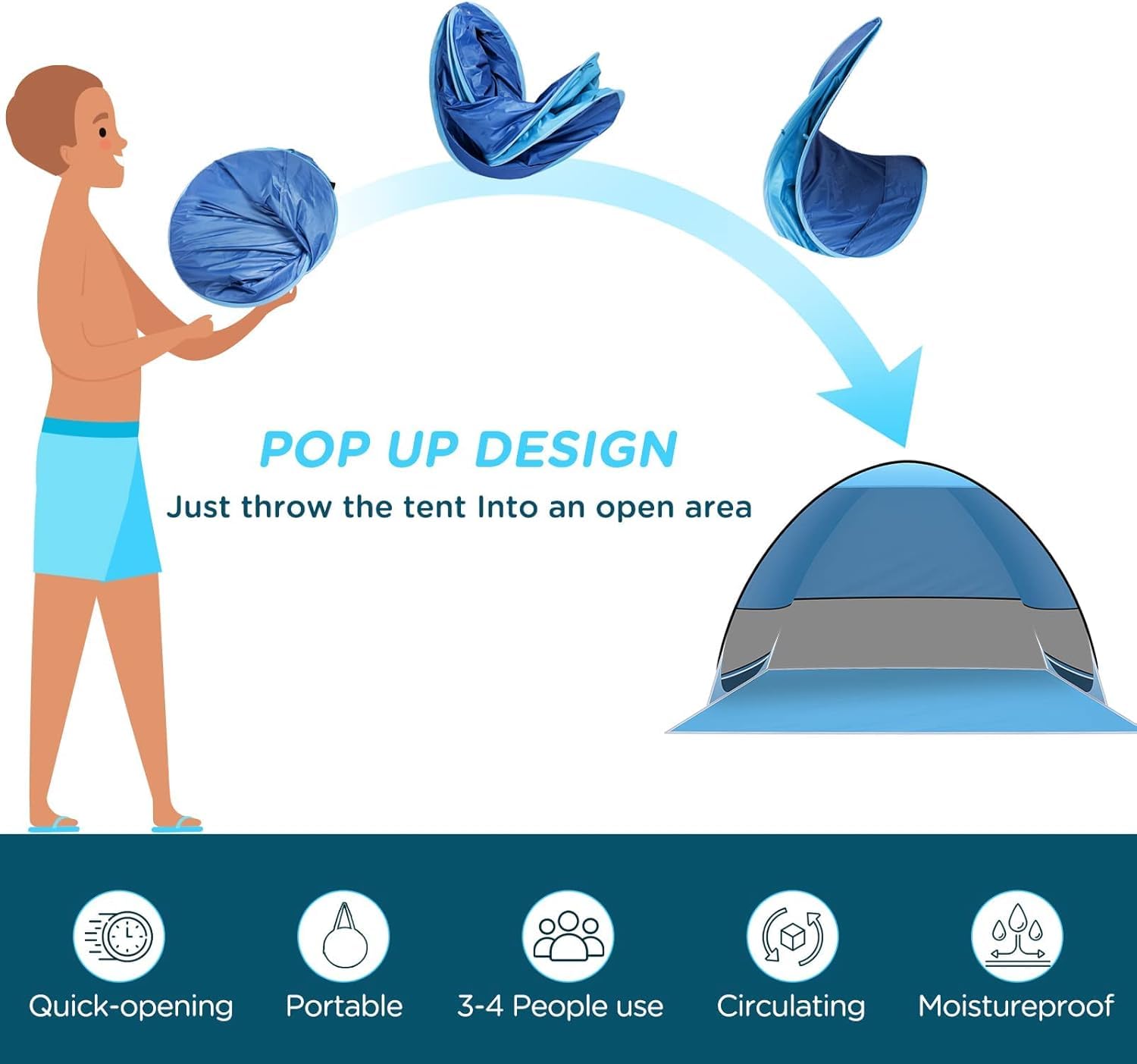 ["🏝️🌈【Instant Pop up Design】- Beach tent Pop up beach tent can be automatically installed in seconds without any assembly and can comfortably accommodate 3-4 people, 2-3 children, or 1-2 adults. The beach tent is also easy to fold, with a diameter of 21 inches and a weight of only 2.8 pounds. It comes with a handbag that is easy to carry and can be easily placed in the car trunk.","🏝️🌈【UV Sun Protection and Waterproof】- Shade tent is made of 190T high-quality sun protection material and provides excellent UV protection (UPF 50+), blocking up to 98% of harmful UV rays, protecting you and your family at all times. The waterproof fabric of the portable sun shelter provides temporary refuge in light rain, so avoid it in heavy rain.","🏝️🌈【Windproof and Good Ventilation】- A heavy-duty tent frame and six sturdy metal poles ensure the tent stays stable in the wind. Foldable curtains and mesh windows increase air circulation, keeping the shade cool and preventing mosquitoes and insects from entering. This provides a cozy beach tent for you, your family, or friends during the hot summer months.","🏝️🌈【Lightweight Design and Easy to Carry】- 79 x 65 x 51 inches (L x W x H), suitable for 3-4 people, folded up only 50 cm small, very light and easy to carry. It is an ideal travel tent that can also be easily carried to the beach or park.","🏝️🌈【Versatile Use】- The pop-up tent can be used as a beach hut, outdoor shelter, sunshade, or sun protection tent, suitable for parks, camping, beach, fishing, hiking, or weekends. Furthermore, it can be used as a backyard or school play space for birthday parties, carnivals, etc."]