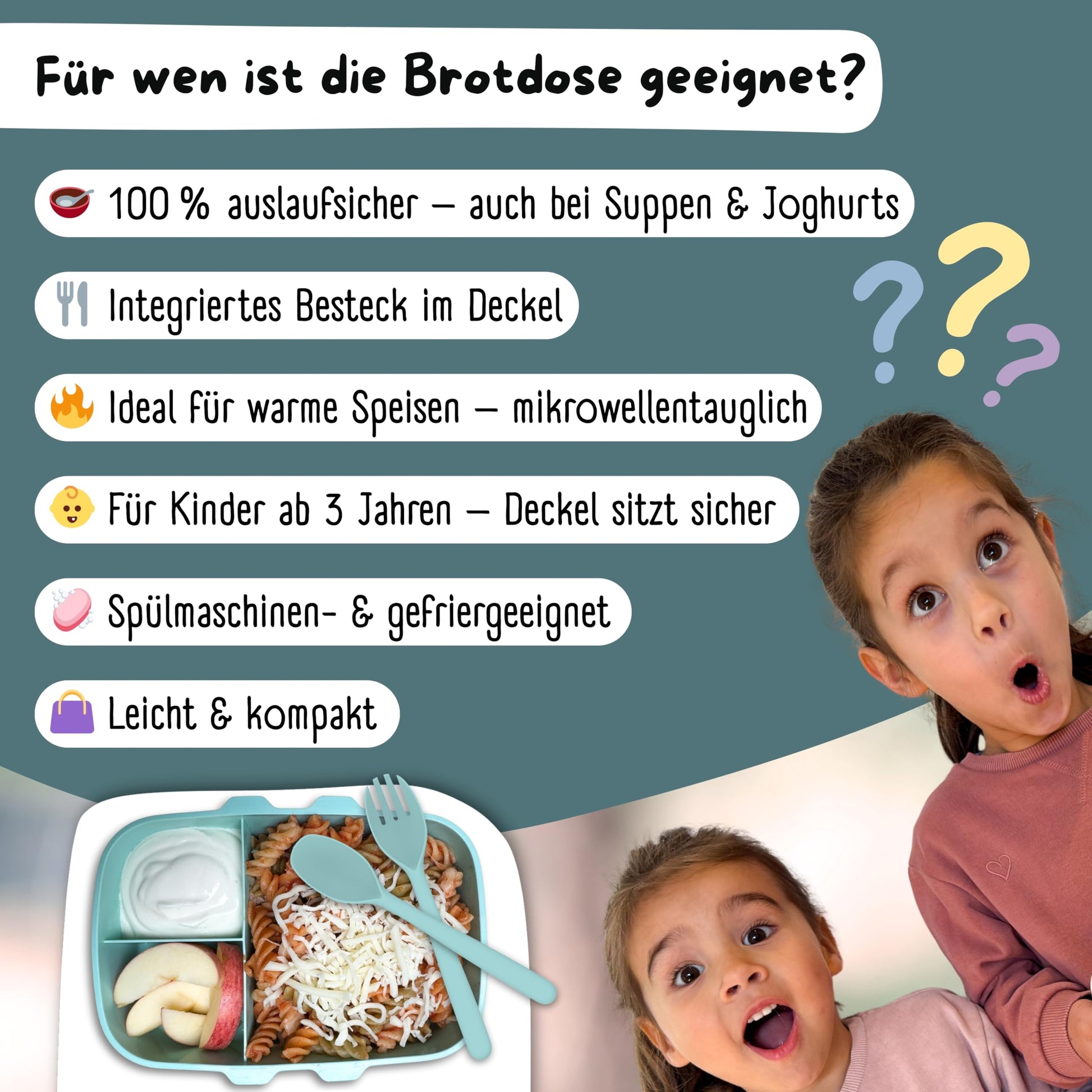 ["❤️ STYLISH and VERSATILE: Our lightweight food containers come in many colors and different designs","❤️ PRACTICAL: Versatile and easy to use: Our small microwave-safe & dishwasher-safe kids lunchbox with compartments and click-lock lid is perfect for daycare and school. Also freezable for maximum flexibility!","❤️ LOOKING FOR a lunchbox for kids, bento box for kids, lunch box, kindergarten lunchbox, or snack box for kids, then our bento box might be the perfect match for you.","❤️ SAFE & HEALTHY: Our kids lunchbox with compartments has been tested by an independent laboratory. BPA-free, free from plasticizers & food-safe.","❤️ 100% LEAK-PROOF: The middle lid seals off the individual compartments and prevents mixing of foods. Also suitable for liquids."]