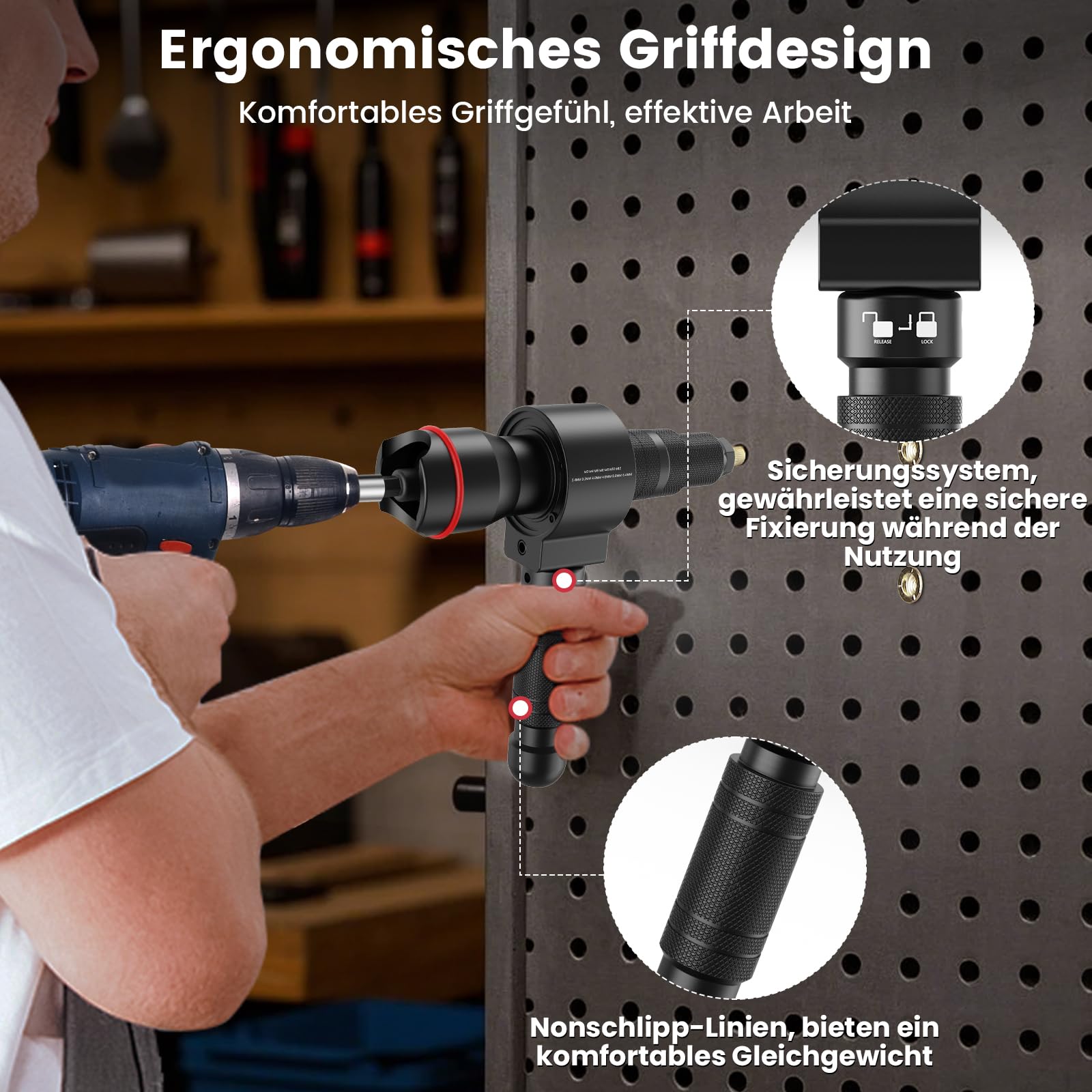 ["2 in 1 Rivet Nut & Rivet Gun Set: Our 2 in 1 blind rivet gun set is designed with a hex thumb ladder that seamlessly combines with 18V-24V battery chargers and screwdrivers to easily convert them into strong rivet and screw mandrel tools. This versatile cordless rivet gun set is your key tool for precise riveting with aluminum and steel mandrels. (All drills must have a torque limiting clutch, set the clutch to the minimum required force to avoid damaging the mandrel)","Interchangeable Rivet Nuts & Blind Rivets: The pop rivet gun set adapter kit includes 7 metric mandrels and 6 sizes of rivet heads (M3, M4, M5, M6, M8, M10, M12) (2.4mm, 3.2mm, 4.0mm, 4.8mm, 6.0mm, 6.4mm). Each size of the rivet is equipped with 5 nuts to meet your various riveting needs. Everything is organized in a rugged carrying case, for easy storage and transport","Durability & Lightweight Construction: The main body of our electric rivet adapter set is made of lightweight alloy, the blind rivet gun mandrels and nosepieces are made of 35CrMoV steel, a high-quality material that ensures long-lasting performance. This combination of materials is sustainable and supports your creative and professional endeavors with reliability for years to come","Humanized Handle: Our threaded rivet gun set is designed with an integrated handle with anti-slip lines, providing a comfortable angle force to achieve perfect work. The handle is equipped with a locking and releasing system (the nut is unscrewed from the nut spindle by turning the body), effectively ensuring torque management and secure fastening during use","Complete Package: Your purchase includes the Beaspire 2 in 1 rivet gun set tool (without electric drill), 7 sizes of nut mandrels, 6 sizes of rivets, 35 nuts, 30 rivets, 1 screwdriver, 1 hex key, 1 handy box, and 1 instruction manual. Everything you need for professional riveting is included in this threaded rivet gun and blind rivet nut gun set","Assembly required: After delivery, refer to our installation videos for instructions"]