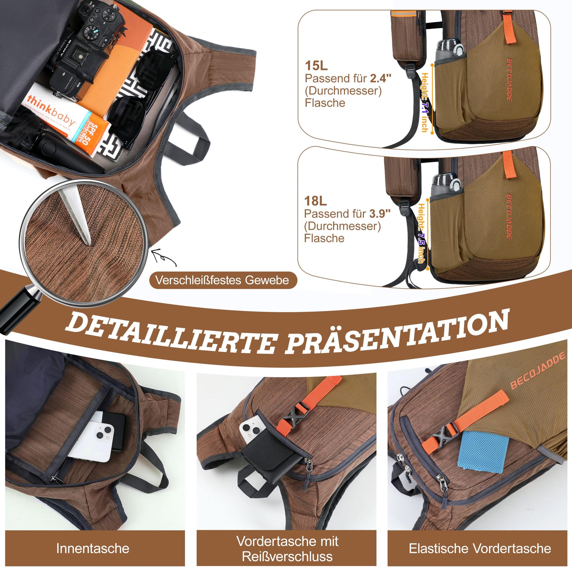 BECOJADDE 18L Hiking Backpack Men Small Backpack Women Lightweight Daypack Foldable Trekking Pack for Camping Outdoor Hiking Travel Chocolate Brown