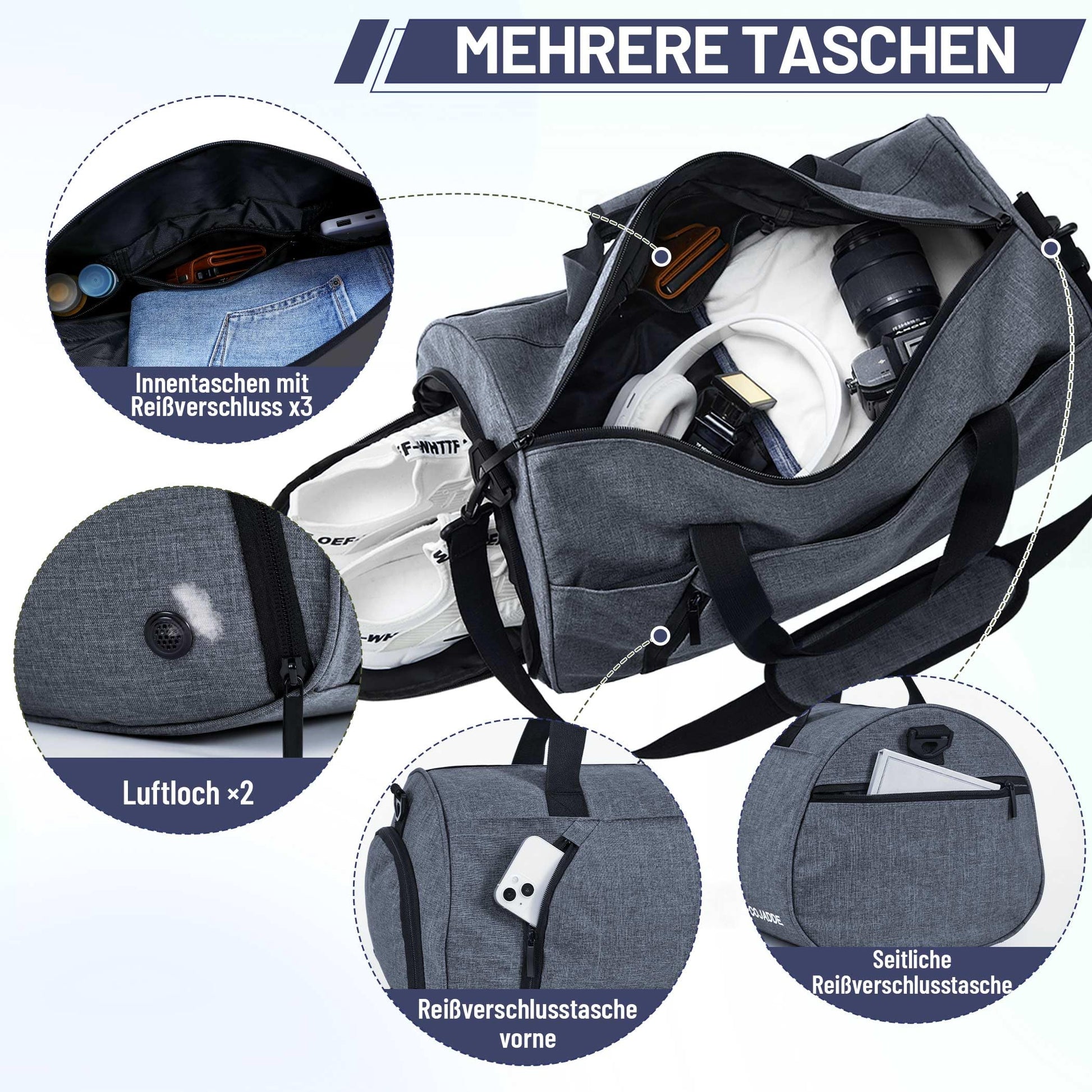 ["High-quality materials】 This gym bag is made of Oxford fabric material, sturdy, practical, and tear-resistant. Detachable shoulder straps and padded handles relieve the pressure on the shoulder and hand.","【Large Capacity Travel Bag】 The travel bag has 1 large main compartment with 3 small interior pockets, including 2 mesh pockets and 1 small pocket. 1 waterproof wet compartment, 1 ventilated shoe compartment, 1 medium-sized front pocket, and 1 side pocket. Multiple pockets and large capacity to organize everything.","【Shoe Compartment and Wet Bag】 This gym bag is equipped with a separate shoe compartment with 2 ventilation openings to separate dirty shoes from clean clothes and solve the odor problem. In the wet bag on the front of the gym bag, you can separate wet clothes, toiletries, cold drinks, etc. Dry from wet.","【Practical Designs】 The gym bag with detachable straps and padded adjustable shoulder straps, carry the fitness bag as a backpack, as a duffel bag, or as a shoulder bag. The luggage strap on the back of the travel bag can be hung on the suitcase, so you can have hands-free.","【Multifunctional Carry-On Bag】 Travel bags, gym bags, weekend bags, workout bags, luggage bags. Perfect for fitness, basketball, swimming, yoga, travel, camping, hiking, and many outdoor activities."]
