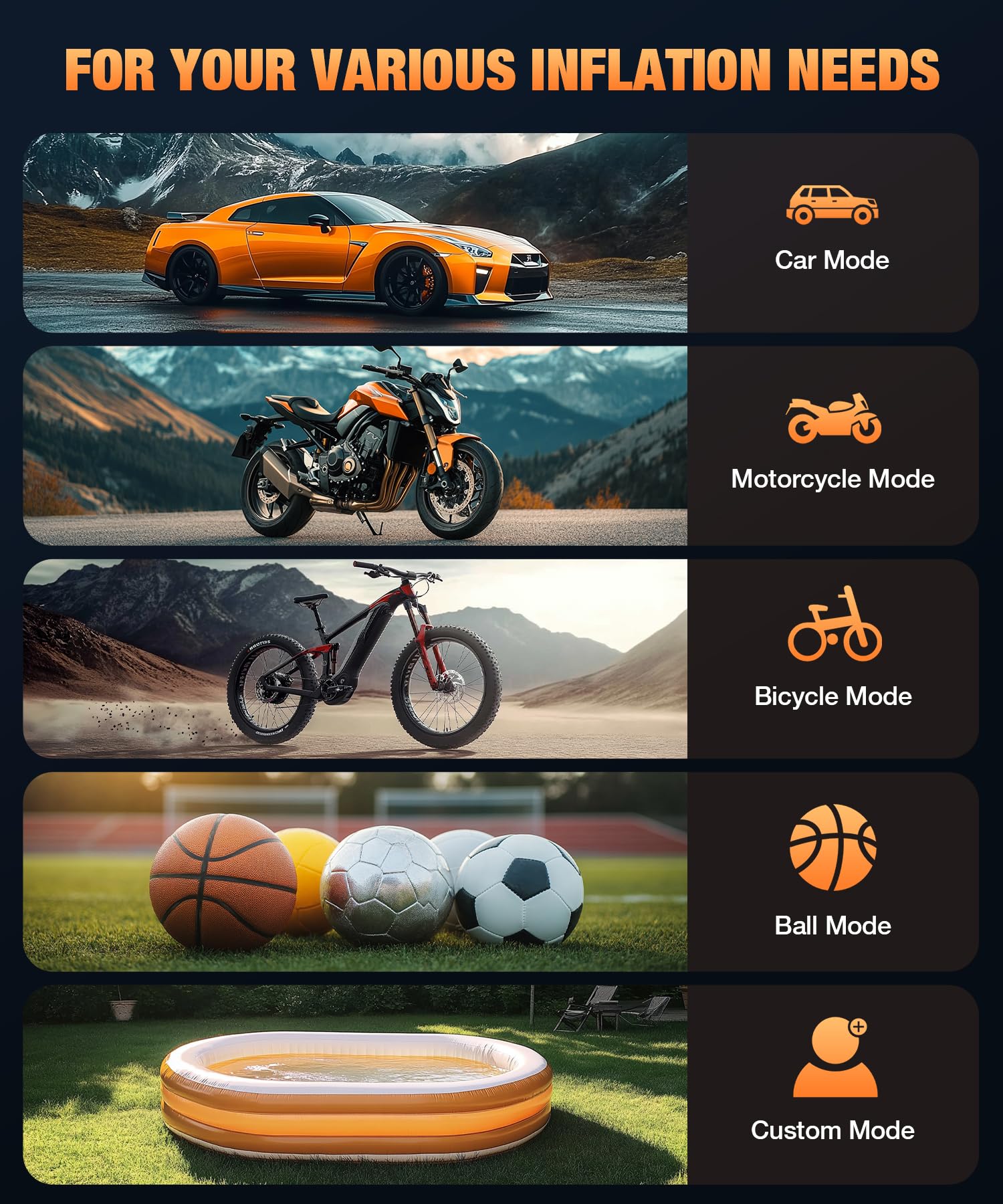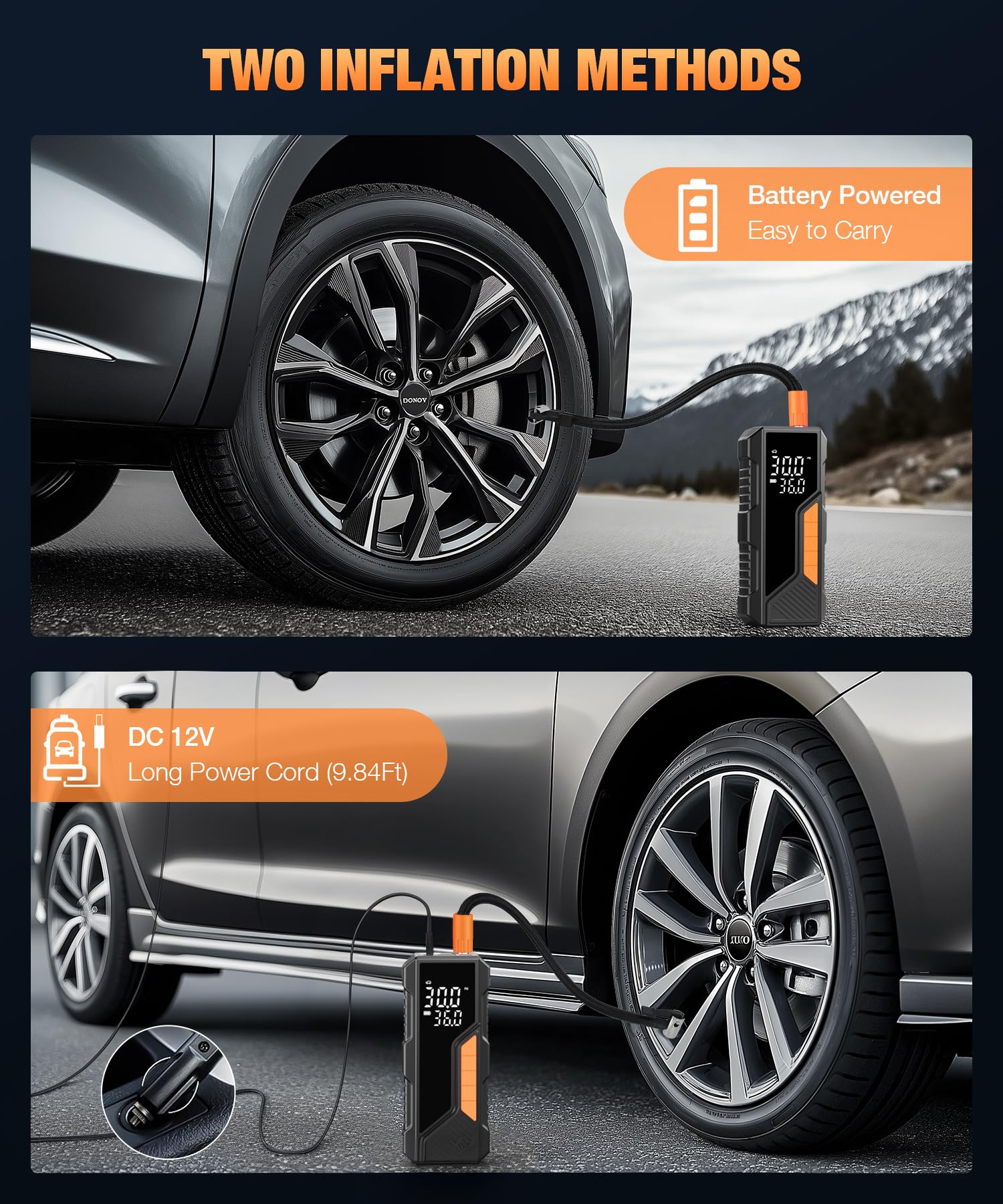 ["Fast Inflation】The maximum pressure of the portable electric air pump is 150 PSI, the air flow is 36 l/min, it can rise from 32 PSI to 36 PSI in 50 seconds, and it can inflate 3-4 195/55/R15 car tires with a full charge (0-36 psi)","【5 Inflation Modes】The cordless battery compressor has four preset inflation modes suitable for bicycles, motorcycles, cars, and balls. In the fifth custom mode, the pressure value can also be adjusted according to the inflated object to meet different inflation requirements.","【Multifunctional Inflatable Tire Pump】Can be used as an emergency power source for charging mobile phones or other electronic devices. There is an LED light on the top to help you inflate tires, change tires, or warn other vehicles at night, giving you a sense of security during your travel experience","【LCD Dual Screen】The air tire pump can clearly display the real-time pressure value and the preset pressure value. The measurement accuracy is ±0.5 PSI, making it easier to monitor tire pressure. When the preset value is reached, it automatically shuts off to make inflation safer","【Portable Design】The electric bicycle pump features a wireless design, is compact, and comes with a storage bag, making it easy to transport and store in a backpack or suitcase, making it especially suitable for self-driving trips. It is not only a necessity for daily life and long trips, but also a perfect gift for friends and family."]