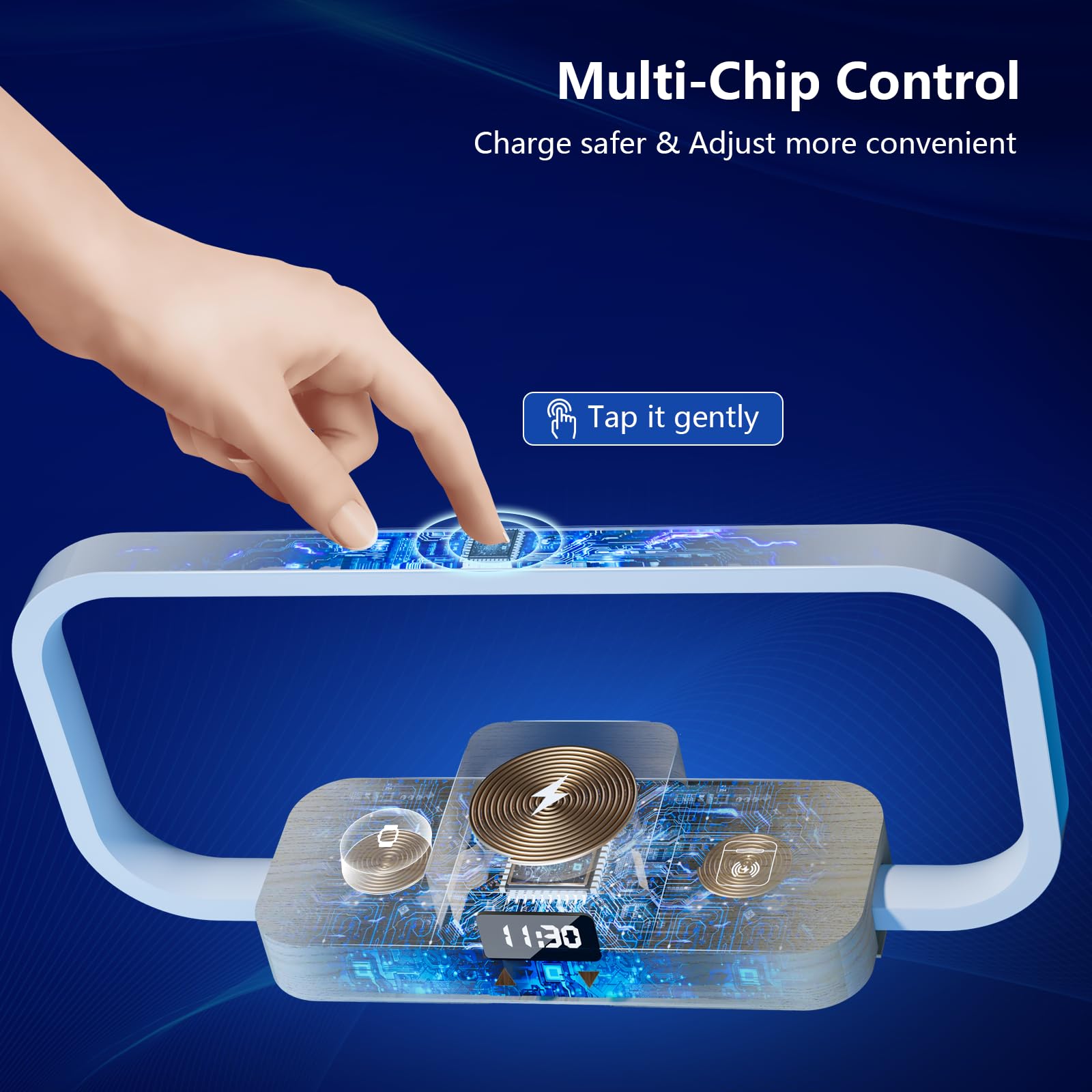 ["Eye-Friendly LED Desk Lamp】The minimalist and stylish design of the touch dimmable desk lamp creates a pleasant feeling in your home. Equipped with professional LED beads and highly sensitive chips, the brightness can be adjusted continuously by gentle touch. An ideal USB desk lamp for living room, bedroom, study, children's room, etc.","【Nightstand Lamp with 3-in-1 Charging Function】Say goodbye to your messy table full of tangled cables. Our wireless charging lamp provides fast wireless charging up to 10W and efficiently charges your compatible devices: iPhone 15/14/13/12/11 series and other phones that support wireless charging; Apple Watch 9/8/7/6/5/4/SE, Airpods Pro/3/2","【5 Lighting Color Modes & Stepless Dimming】The LED lamp is equipped with 5 color modes for versatile lighting options. You can choose the comfortable mode for the atmosphere you need while working or resting. Our touch-control desk lamp provides a more uniform and softer light, protecting your eyes and creating a cozy atmosphere for you and your family","【Clock Display & Extra USB Charging Port】Desk lamp with clock can be placed on your nightstand or desk, the LCD display can clearly show the time. And you can adjust the brightness of the clock to feel comfortable. With the rear USB charging port, you can charge your tablets, Kindles, diffusers, speakers, or other electronic devices, whether the lamp is on or off","【Clock Display & Extra USB Charging Port】Desk lamp with clock can be placed on your nightstand or desk, the LCD display can clearly show the time. And you can adjust the brightness of the clock to feel comfortable. With the rear USB charging port, you can charge your tablets, Kindles, diffusers, speakers, or other electronic devices, whether the lamp is on or off"]