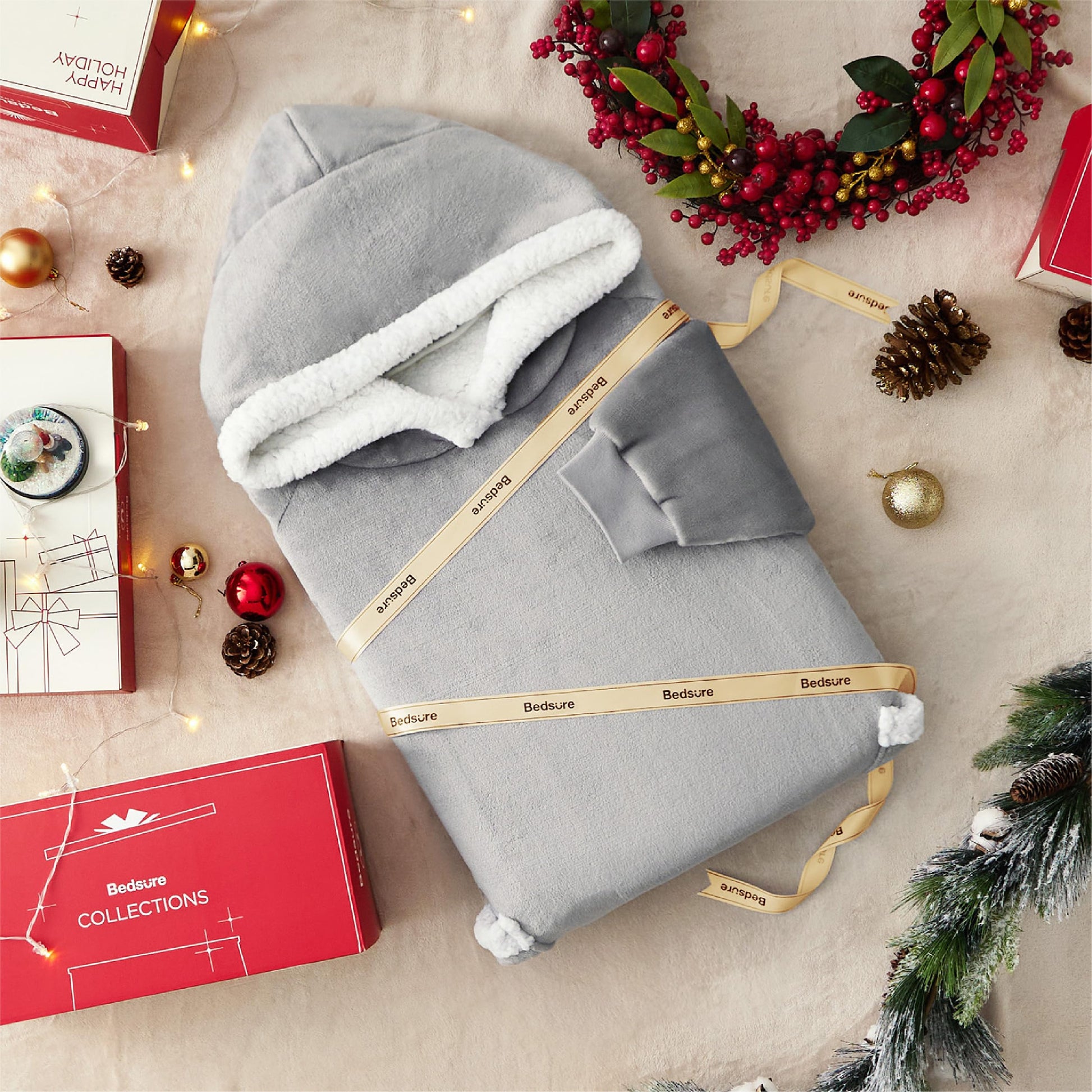 BEDSURE Hooded Blanket with Sleeves - Sherpa Sleeved Blanket Hoodie for Women, Grey, 110x90cm. Perfect gifts for women.