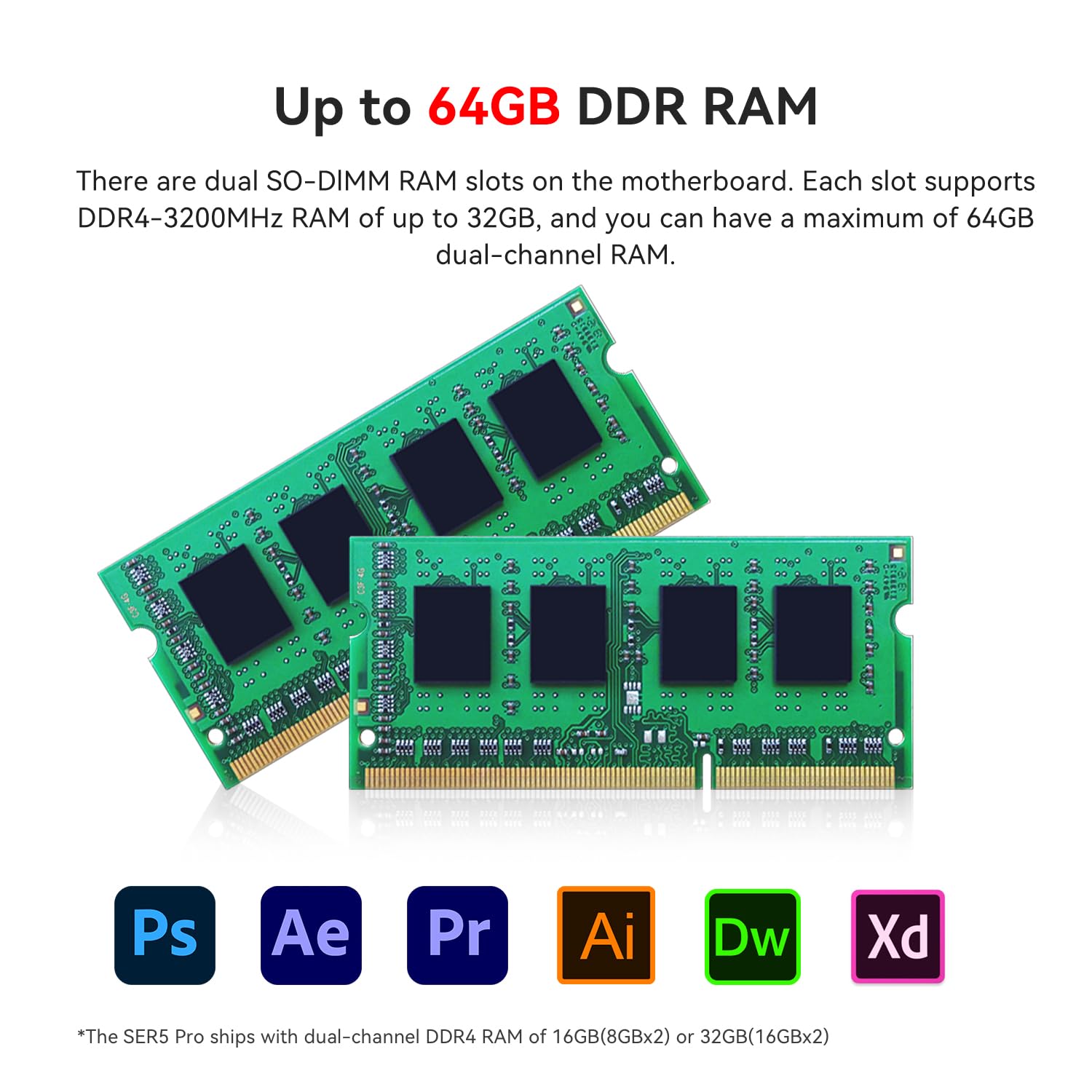 ["š„ćPowerful PerformancećBeelink SER5 Pro Mini PC is equipped with a Ryzen 7 5825U processor (8C/16T, up to 4.5GHz), providing a very smooth experience for your visual home entertainment, video streaming, web browsing, work, and light gaming.","š„ćLarge Storage & ScalabilityćBeelink SER5 Mini PC comes with Dual Channel 32GB DDR4, supports up to 64GB(2*32G). 500G M.2 2280 PCIe3.0 SSD with a read speed of 3000MB/S, supports SSD upgrade to 2TB (excluded).","š„ć4K Triple Screen DisplayćThe SER 5825U Mini PC is equipped with AMD Radeon Graphics and supports 4K video playback. Beelink SER5 supports three screens simultaneously via HDMI2.0, DP1.4, and Type-C, effectively increasing work efficiency.","š„ćWiFi 6 & Bluetooth 5.2ćMini PC is equipped with WiFi 6 (802.11ax) with a transmission speed of up to 2.4Gbps, low latency, and fast speed. Bluetooth 5.2 ensures a stable connection with your Bluetooth devices and keeps your desk tidy.","š„ćReliable Support ServicećAll our products have obtained CE certification. If you have any questions, please feel free to contact us. We provide lifelong technical support, 24/7 customer service, and a 1-year warranty."]