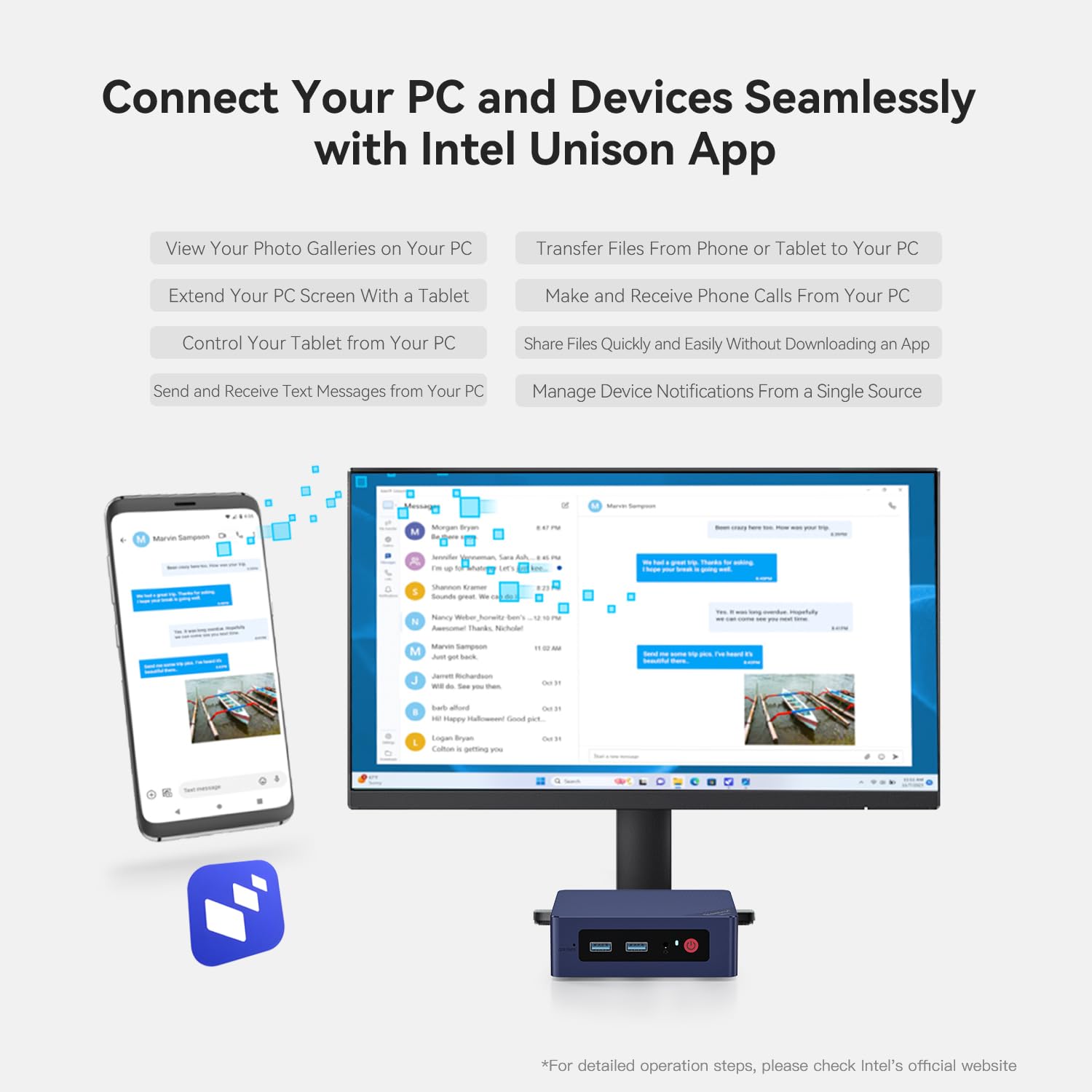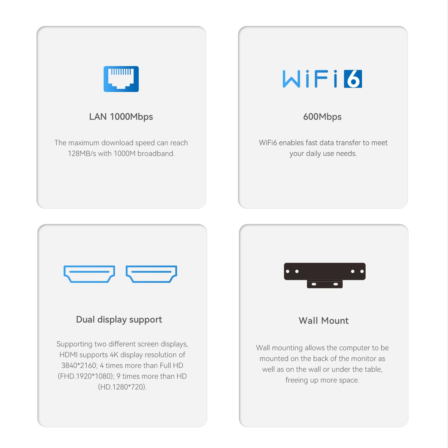 ["Processor updated: The mini PC is equipped with Twin Lake N150 processor. 4 cores and 4 threads, 6MB smart cache, max turbo frequency 3.6GHz (TDP up to 25W), the high-performance office mini PC is. It is a reliable choice for business office, online education, entertainment, and daily use.","Dual-screen display: Dual-screen display can be achieved by connecting 2*HDMI ports, making office work smooth and improving work efficiency. The mini PC is equipped with Graphics 24EUs 1000MHz, supports 4K HD video playback, provides high image quality, and offers a better visual experience.","Large capacity: Integrated 16GB SO-DIMM DDR4 RAM and 500GB M.2 2280 SSD (Dual SSD slots support up to 4TB). The large memory allows for successful opening of software and free switching between multiple tasks, significantly reducing software loading time.","Enjoy wireless experience: Supports WiFi6 (AX101), stable and efficient transmission speed, enabling fast data transfer to meet your daily and professional requirements. Built-in Bluetooth 5.2, which makes connecting headphones and mice less prone to interruptions and more stable. With 1000M LAN, the network speed is superior, ensuring the performance and stability of the network speed.","Compact and rich interface: small and portable with wall bracket, clean desktop and space-saving. Multi-interface design, flexible expansion to meet your needs. The mini PC is designed with 4*USB3.2 Gen2, 2*HDMI, 1*Realtek 8111H 1000M LAN, 1*phone jack, 1*DC jack, which is easily suitable for various application devices to meet office, entertainment, and everyday needs."]