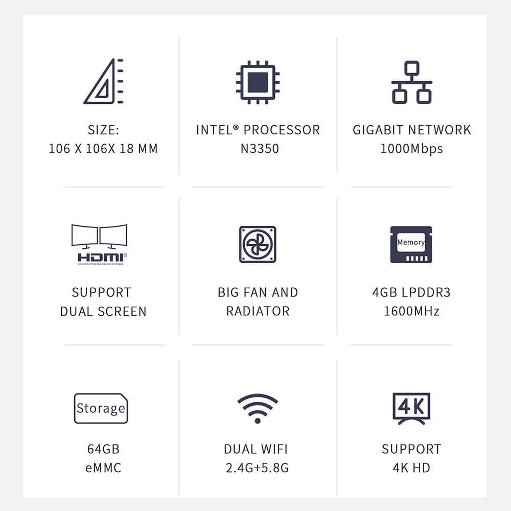 ["Efficient Processor】 The mini computer is equipped with a Celeron N3350 dual-core processor up to 2.4GHz, allowing you to easily access your favorite shows and movies through simple and responsive navigation and quick start applications.