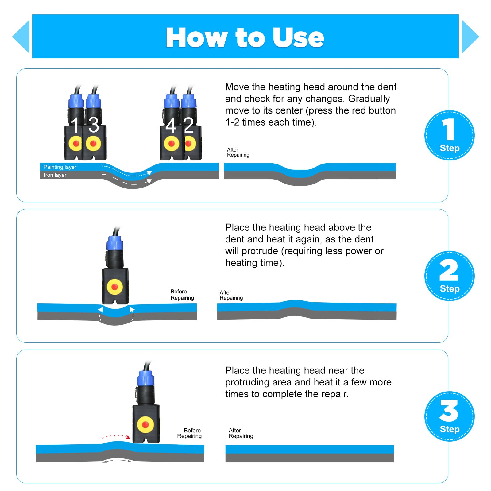 [Durable and High Efficiency] With a maximum power of 1.34KW, this dent repair tool effectively repairs minor dents on body and door surfaces. The high efficiency saves you a lot of time during the repair process. The induction heater has multiple heat dissipation openings on the back and bottom, which effectively dissipate heat and extend the machine's lifespan.
