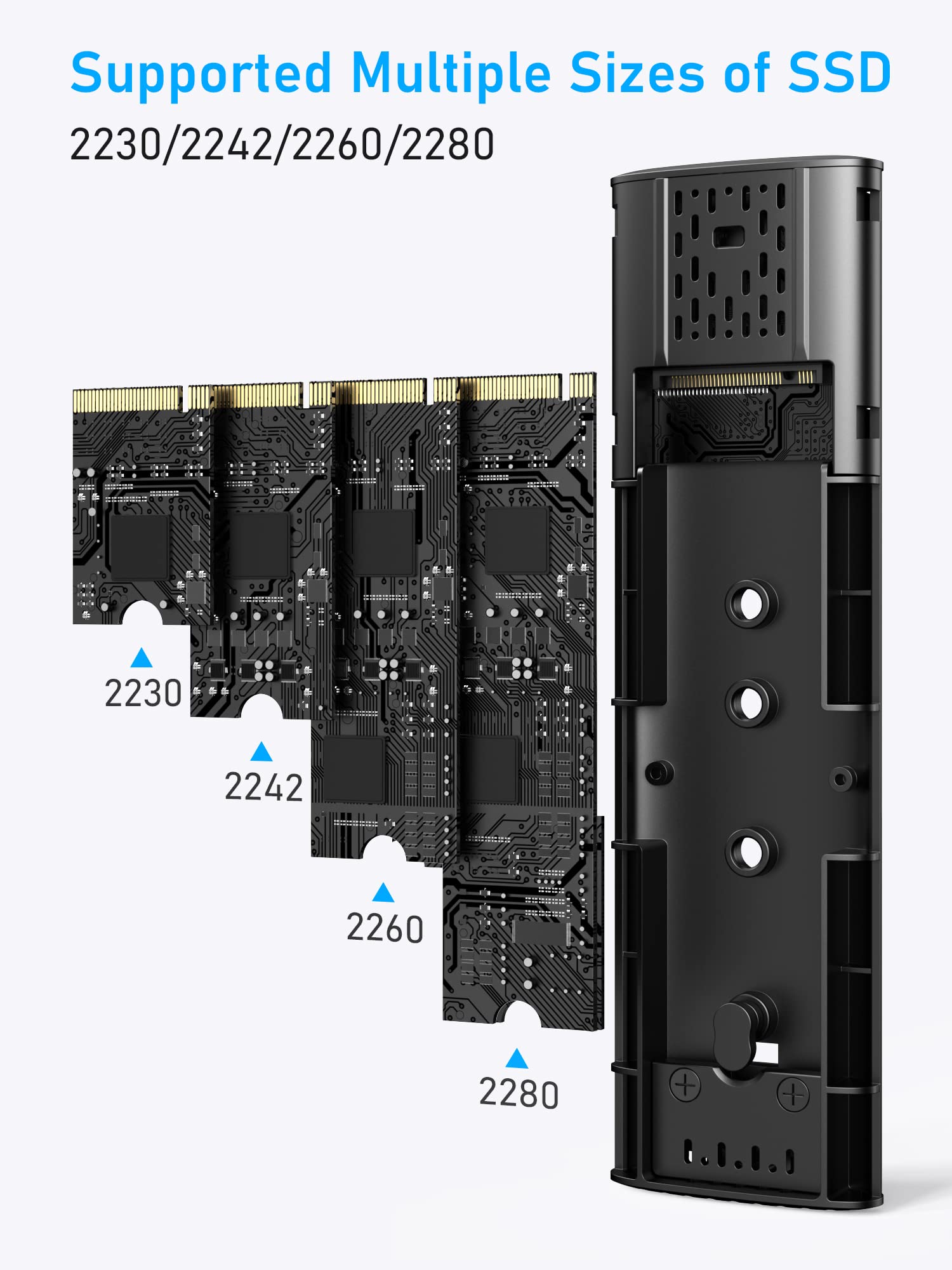 π["Wide Compatibility"] This SSD enclosure supports 4 sizes of M.2 NVME and SATA hard drives-2280/2260/2242/2230, no additional drive required and compatible with Windows 7/8/10/11, Mac OS, Linux, plug-and-play, easy to use.