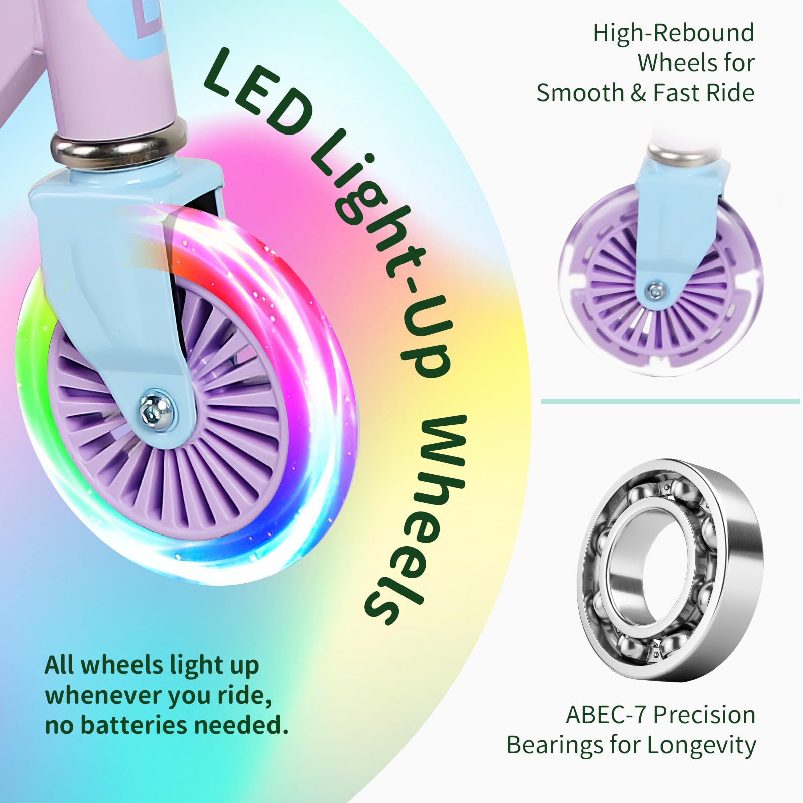 ["New LED Scooter for Kids: The kids scooter features glowing LED wheels that do not require batteries. The lights get brighter the faster the child rides. With battery-powered LED lights on the T-bar and deck that can be turned on and off, creating 7 color-changing modes lighting effects. Make night riding safe. Kids will love this special feature that makes the scooter unique! (Batteries not included.)","Adjustable and Stable: With flexible height adjustment function, the city scooter for kids grows with the child's height, adjustable between 78-88 cm. Adjust the most suitable height anytime, anywhere. Let the scooter accompany the kids through their happy childhood. Designed for kids aged 3-12 years, under 62 inches tall","Folding and Lightweight: BELEEV V2 scooter for kids easy to fold and unfold in seconds, easy to use, easy to carry, it weighs only 7.6 pounds. Bring a cool scooter and let the kids confidently and joyfully slide in skate parks or on the street","Comfortable Riding Experience: The kids scooter 2 wheels is equipped with 120mm large wheels and low-friction ABEC-7 bearings, providing a much safer and smoother ride on uneven sidewalks or rough road surfaces. Integrated rubber handle grips provide comfort, stability, and are not quickly worn out. The extra wide and lower deck allows for easier and faster gliding on paved surfaces, gaps, and more","Better Durability and Safety: The kids scooter is designed to withstand the use and abuse by children and supports riders weighing up to 50 KG (110LBS). The long rear fender brake efficiently stops the scooter when braking and extends the life of the wheels. The kids scooter deck features non-slip grip tape for safe riding, better control and safe driving, as well as a pattern design for added flair"]