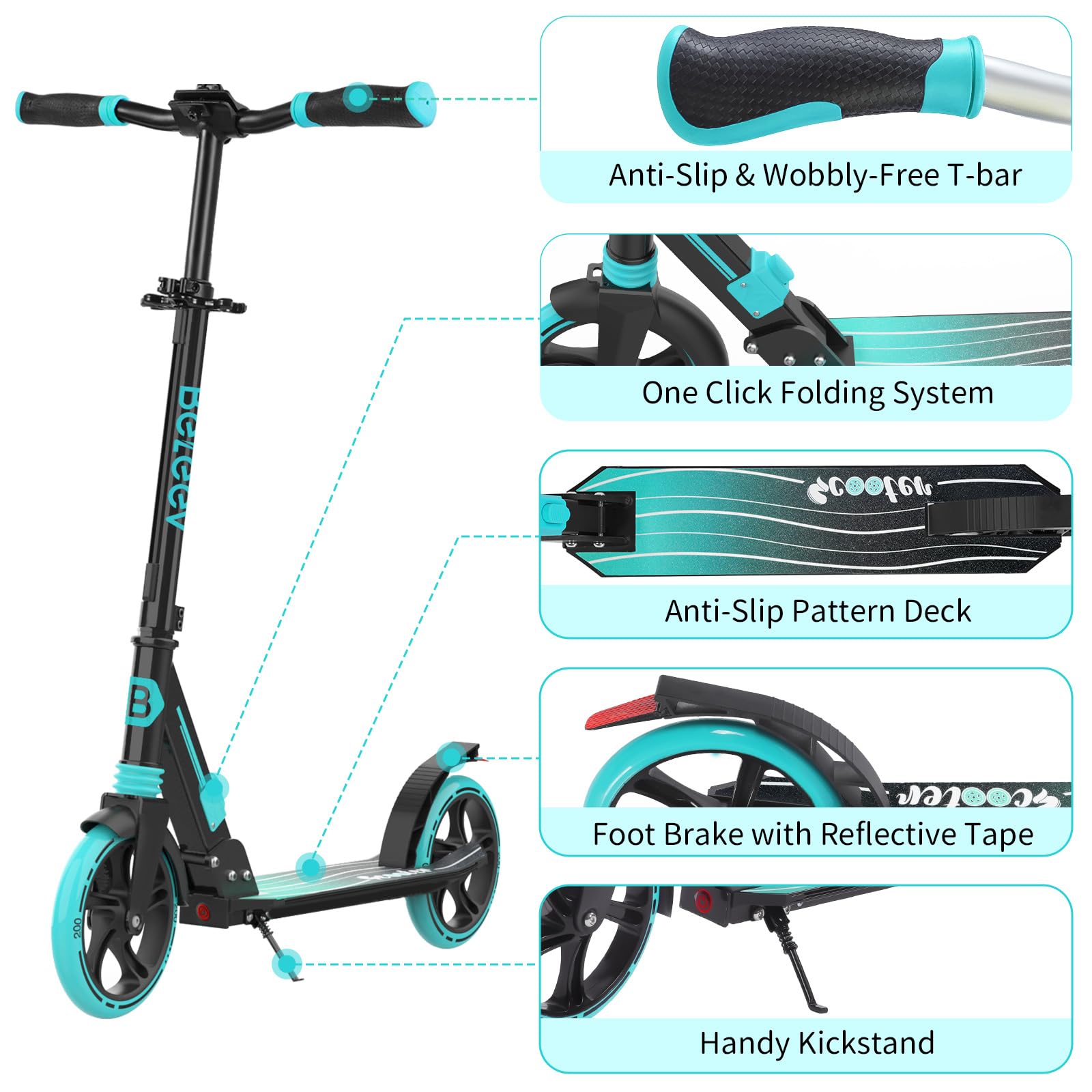 "["Cool ride with added safety: Each aluminum city scooter features battery-powered LED lights on the handlebars and deck that glow in 6 vibrant colors and can be easily turned on or off. These lights provide better visibility and safe riding, especially on darker days. (Batteries not included.)","Adjustable as Kids Grow: This foldable adult kick scooter has wide handles that can be adjusted to four different heights (adjustable range: 31.5 - 40.9 inches). This allows the handlebar height and comfort to be individually adjusted, so riders of all sizes can enjoy scootering without sacrificing comfort. Thanks to the height adjustment, the scooter can grow with your children, saving you the cost of a new scooter every year!","Safety and Comfort Features: Rubberized grips provide extra comfort and a secure hold. The T-bar clamp ensures a stable and secure ride, even on uneven sidewalks without handlebar wobbling. The extra-wide platform of the scooter measures 20.9*8.3 inches and offers excellent grip to provide you with an easy and stable riding experience. Supports up to 220 lbs. Scooter suitable for children aged 6/8/10 years, teenagers, and adults.","Excellent Riding Comfort for any route: Our kids scooter is equipped with 200mm high-rebound PU wheels, ABEC-9 bearings, and a shock absorption mechanism. These components provide a smooth and comfortable ride on hard and uneven surfaces, making it suitable for various types of sidewalks. After the upgrade, the rear wheel braking mechanism is equipped with red reflectors to ensure safety during night rides.","Easy to use and portable anywhere: The 2-wheel Big wheels Scooter requires no assembly and is ready to use right away. Folding it is easy and requires no tools! A carrying strap allows you to transport the scooter easily anywhere. In addition, the scooter is equipped with a side stand so it can be parked at any time. The aluminum scooter is very lightweight, weighing only 9.5 lbs."]"
