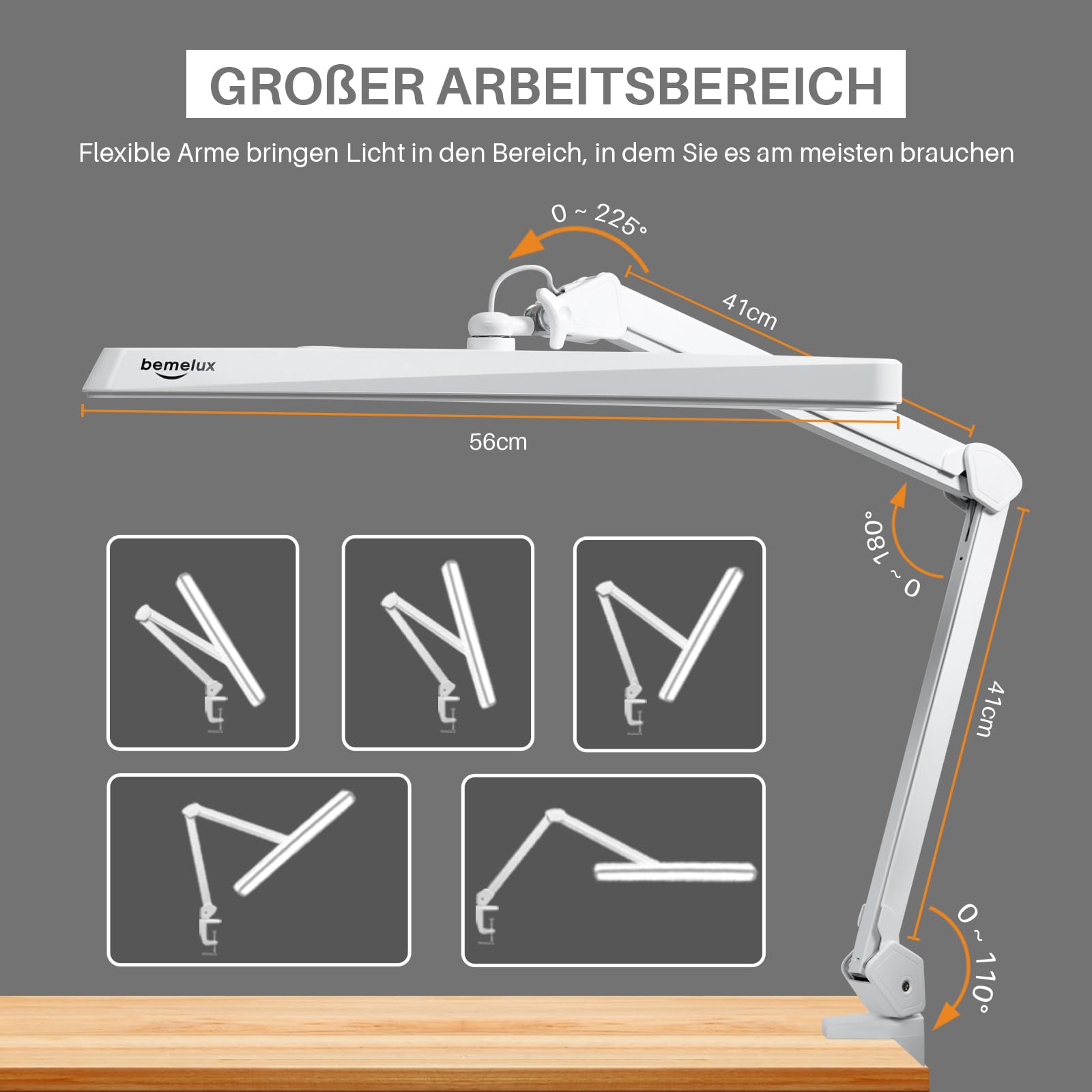 bemelux Rotatable LED desk lamp with clamp, 24W, 2000 lumens, 56cm ultra-wide lampshade, 234 SMD LEDs, 5 brightness levels, 5 adjustable color temperatures (White)
