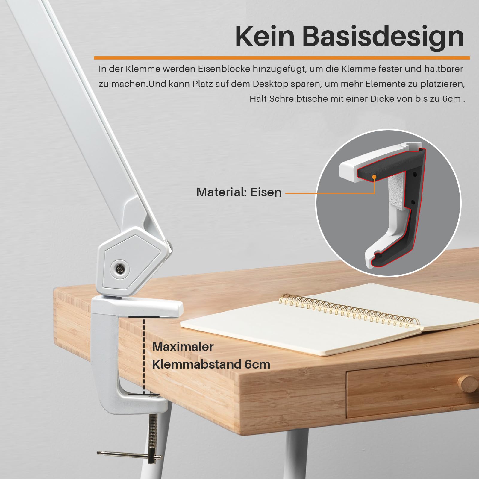 ["25 brightness options: 5 color modes × 5 brightness levels to choose from, ideal for working, studying, reading, and relaxing. 24W super bright light (6000K daylight) provides precise details/colors, 50,000 hours lifespan reduces frequent lamp changes.","Eye protection technology & memory function: 55.88cm wide-angle lamp head offers uniform lighting field; 234 high-quality LED beads deliver soft light (no glare/ghosting), gentle on the eyes. Memory function: Previous settings are retained when turned on again.","Excellent product design: 225° rotatable light head and 180° adjustable lamp arm allow flexible angle adjustment. The lamp arm securely holds the head in position (no sagging); cables/parts are hidden in the arm - cleaner and easier to clean than spring arms.","Easy and space-saving installation: With scratch-resistant metal clamp, it can be installed on any flat table edge without tools. The clip supports max. 6cm thick edges, maximizing space on the desk.","Satisfactory service and warranty: All products undergo strict quality tests and offer 3-year after-sales service. For defects, damages, or questions, contact us - we will respond within 24 hours."]
