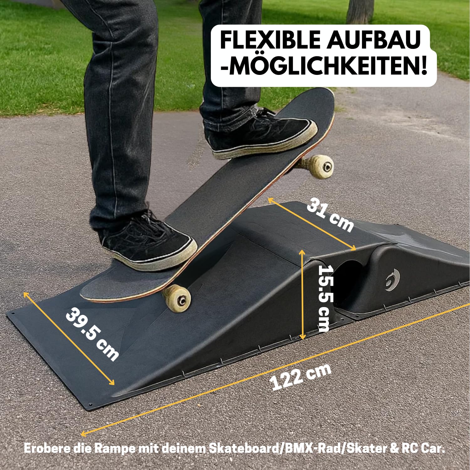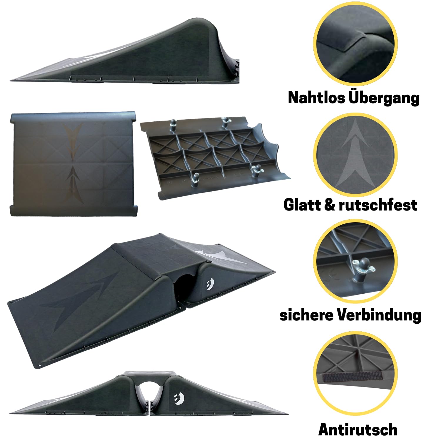 ["EASY ASSEMBLY - The individual parts of the BMX ramp are easily assembled with wing screws. This allows you to disassemble and reassemble the sets and individual parts at any time.","FLEXIBLE BUILDING OPTIONS - We offer you various sets with different, complementary individual parts. For example, you can choose between a single ramp or multiple ramps.","STABLE SUPPORT - Rubber pads provide stable support for our skate ramp. This ensures that the ramp is securely positioned on the ground without the risk of slipping.","COMPACT DESIGN - The skater ramps are compact in both their individual parts and when assembled, making them easy to transport and set up anywhere.","QUALITY WITH CONVICTION - As a Bremen family business, we have been setting trends in sports and leisure products for over 40 years - Your satisfaction is our drive"]