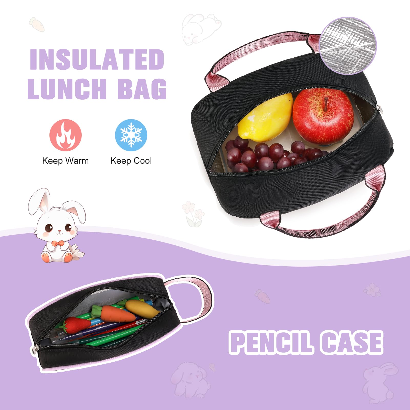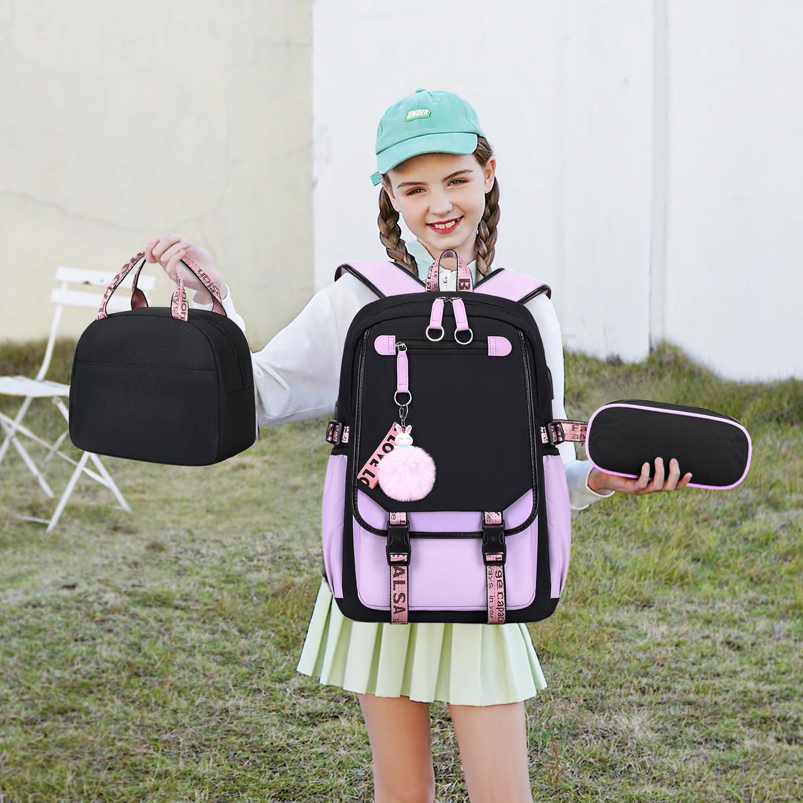 ["【PERFECT COMBINATION】When you buy this set, you will receive the stylishly designed backpack as well as the lunch bag, allowing you to carry your delicious meals to school. Go back to school with this cute backpack & lunch pack set. Whether your child is going to elementary, middle, or high school, this backpack set suits a variety of student needs and is also perfect for travel, camping, hiking, and other outdoor activities.","【DURABLE & WATERPROOF】Made of high-quality, lightweight, tear-resistant 900D Oxford fabric and quilted polyester lining, waterproof, fade-resistant, odorless, durable, environmentally friendly, and healthy. Your books and laptops stay safe even when it's raining on the way home. The backpack has a high-quality design that provides you with a great experience on the way to school.","【COMFORT TO CARRY】The backpack provides a lot of comfort when carrying, as the shoulder straps are especially wide and pleasantly soft padded. The 2" S" shaped padded shoulder straps to minimize stress on the spine. Good padding of the back saves the back and makes carrying more comfortable. The back panel can be adjusted to the child's size, so the backpack grows with them.","【LARGE CAPACITY】With a size of 16.5 x 11 x 7.4'', this backpack is practical enough to easily organize all your items. A large main compartment is suitable for books, pencil cases, lunch boxes, iPads, etc. A separator in the main compartment fits your laptop. Interior pockets hold your wallet and phone. Front pockets perfect for IDs and keys; Two side pockets for water bottle and umbrella. Back hidden pocket can protect your valuables like phone, passport."]
