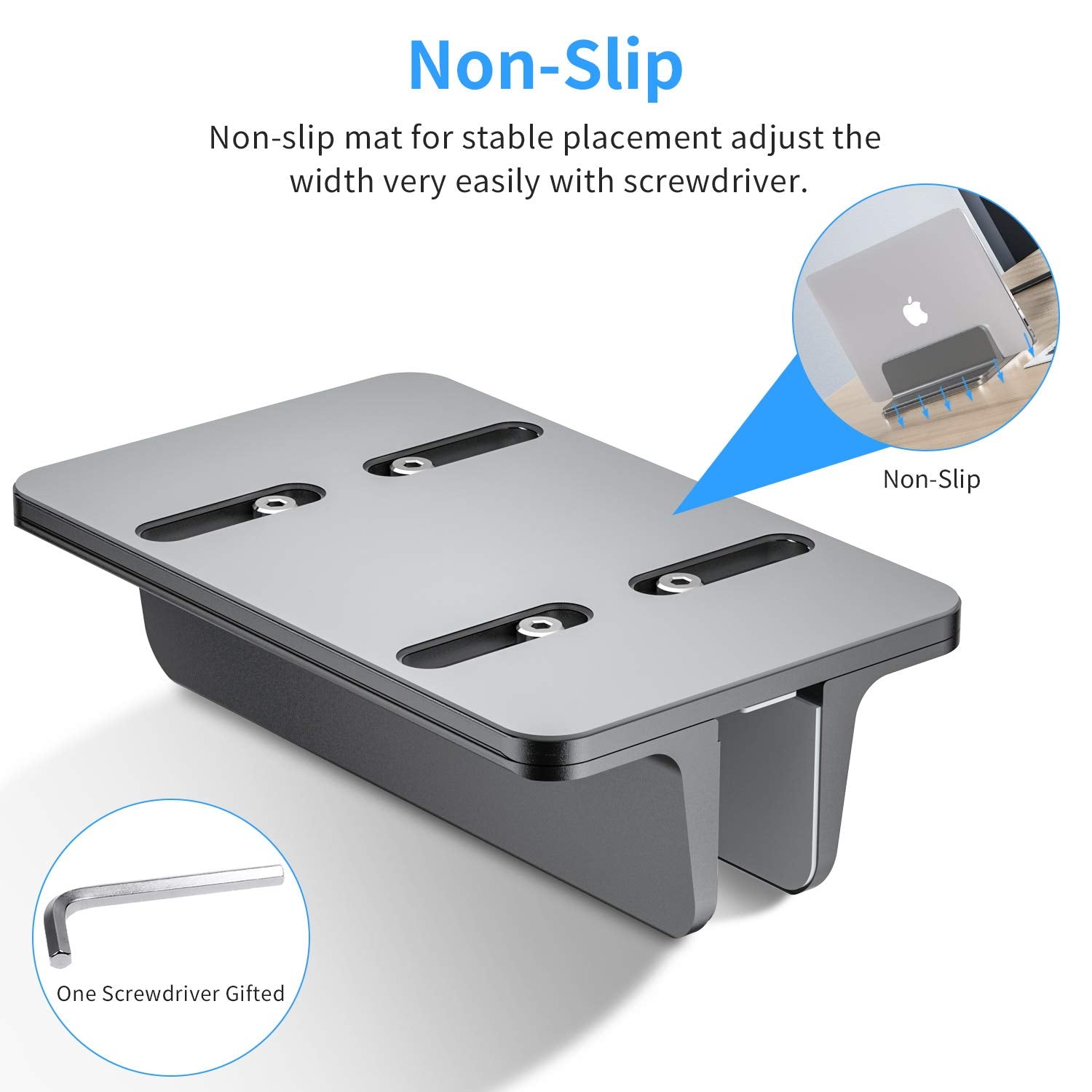 ["Adjustable Width: Adjustable for laptop widths with a thickness of 14 mm to 66 mm. You can adjust the screw to tighten it to the correct size.", "Stable and Secure: A rubber pad and the rubber wall of the holder keep electronic devices securely in the holder, stable on the desk.", "Aluminum Alloy: The vertical laptop stand is made of high-quality aluminum alloy material. The simple and sturdy design, along with a wide base, make the laptop holder stable and wobble-free.", "Wide Compatibility: This stand is not only for MacBook Pro and other laptops, but also for phones, e-books, tablets, or books (bookends).", "Space-saving: The laptop stand is ideal for saving space and creating a neat and organized space for the desk."]