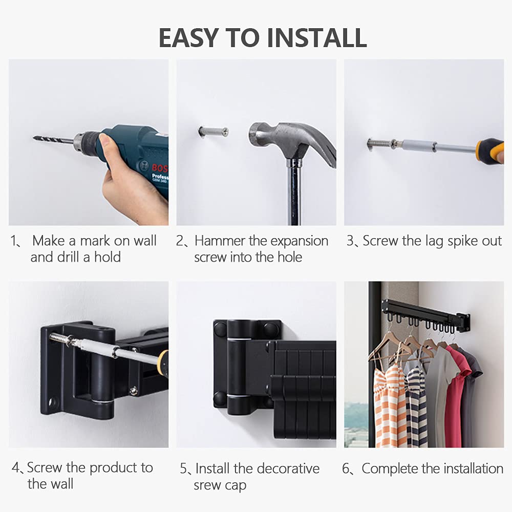 ["⭐ 2 In 1 Garment Rack. Not only a wall-mounted garment rack, but also a storage shelf for household items. Add additional hanging space for the clothing store, home, work space, or dance studio. Perfect for hallway, entryway, bedroom, closet, laundry room or balcony.","⭐ Multifunctional Rotating Garment Rack - 180° rotatable design. Rotate it from 0°-180° depending on your home. You can adjust the angle for hanging to 90° and set it parallel to the wall to save more space.","⭐ Moveable Laundry Rack Hooks. With 12 hooks and 9 round hooks, you can hang many things on it. All hooks are movable, you can adjust the distance between hooks according to your needs. Installation instructions for the fabric rack can be found in this video: https://youtu.be/m6elW6xXq70","⭐ Sturdy and durable: Laundry rack made from a strong aviation-grade aluminum alloy, extremely sturdy and durable. To ensure quality, we have enhanced corrosion resistance with a powder-coated top layer for long-term use and prevented rust buildup.","⭐ Size: 61.5 x 9.1 cm (24.2 inches L x 3.6 inches W). If your wall is a drywall, make sure the garment rack wall mount is secured to the wall studs for support. It holds up to 150 pounds. NOTE: The screws and plastic anchors provided are for solid walls. Please consult the local hardware store if you need screws for other types of walls."]