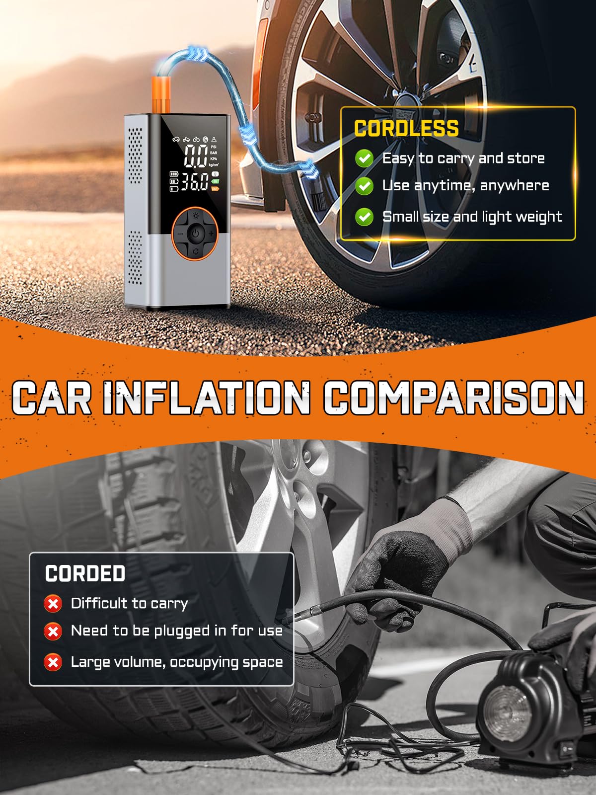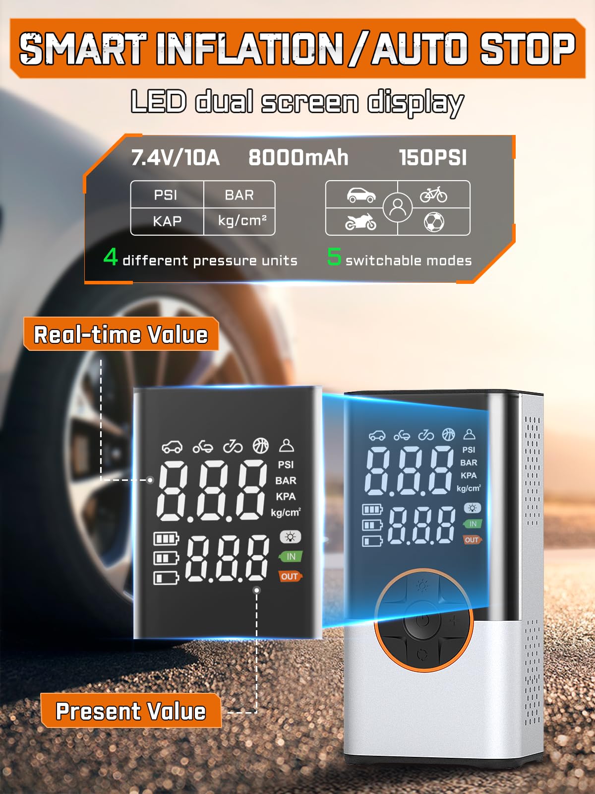 ["Ultra-capacity & Quick inflation: BIBURY electric air pump combines an 8000mAh battery with high-performance chip and turbo motor for ultra-fast inflation (up to 150 PSI). A car tire (195/55/R15) can be filled from 29 to 36 PSI in 1 minute. Includes 4 adapters for car, motorcycle, bicycle, balloons, etc. Ideal for efficient work without loss of time.", "Pre-set pressure with Auto-Stop: The battery compressor with dual LED display accurately shows current and pre-set pressure. 5 inflation modes (Custom/Auto/Motorcycle/Bicycle/Ball) and 4 units (PSI/BAR/KPA/KG/cm²) offer maximum flexibility. Integrated Auto-Stop function protects against over-inflation when target pressure is reached - ideal for safe, hands-free operation.", "Mobile power and LED light 3 in 1: The electric bike pump not only serves as a mobile power supply for charging phones, but also has an LED light with triple function. It can be used as a flashlight, in SOS mode, or as a strobe - particularly useful for nighttime car repairs. After use, it is recommended to take a 15-minute cooling break to avoid overheating and extend the device's lifespan.", "LED display and heat dissipation design: High-resolution LED display shows pre-set values, allowing you to accurately read and monitor tire pressure status even in the dark. The portable electric air pump is designed with a side grille for quick heat dissipation and longer lifespan. Equipped with Type-C charging cable for easy and fast charging. (5V charger is required for charging)", "Compact and Wireless: The wireless design allows for space-saving storage and mobile use without cumbersome cables. The BIBURY electric air pump features ultra-portable dimensions (4.8 x 6.6 x 13.3 cm) and a lightweight of 445 g. Includes carrying bag for maximum convenience during transport. This portable electric bike pump comes with 24 months of customer service, if you have any questions, please feel free to contact us."]