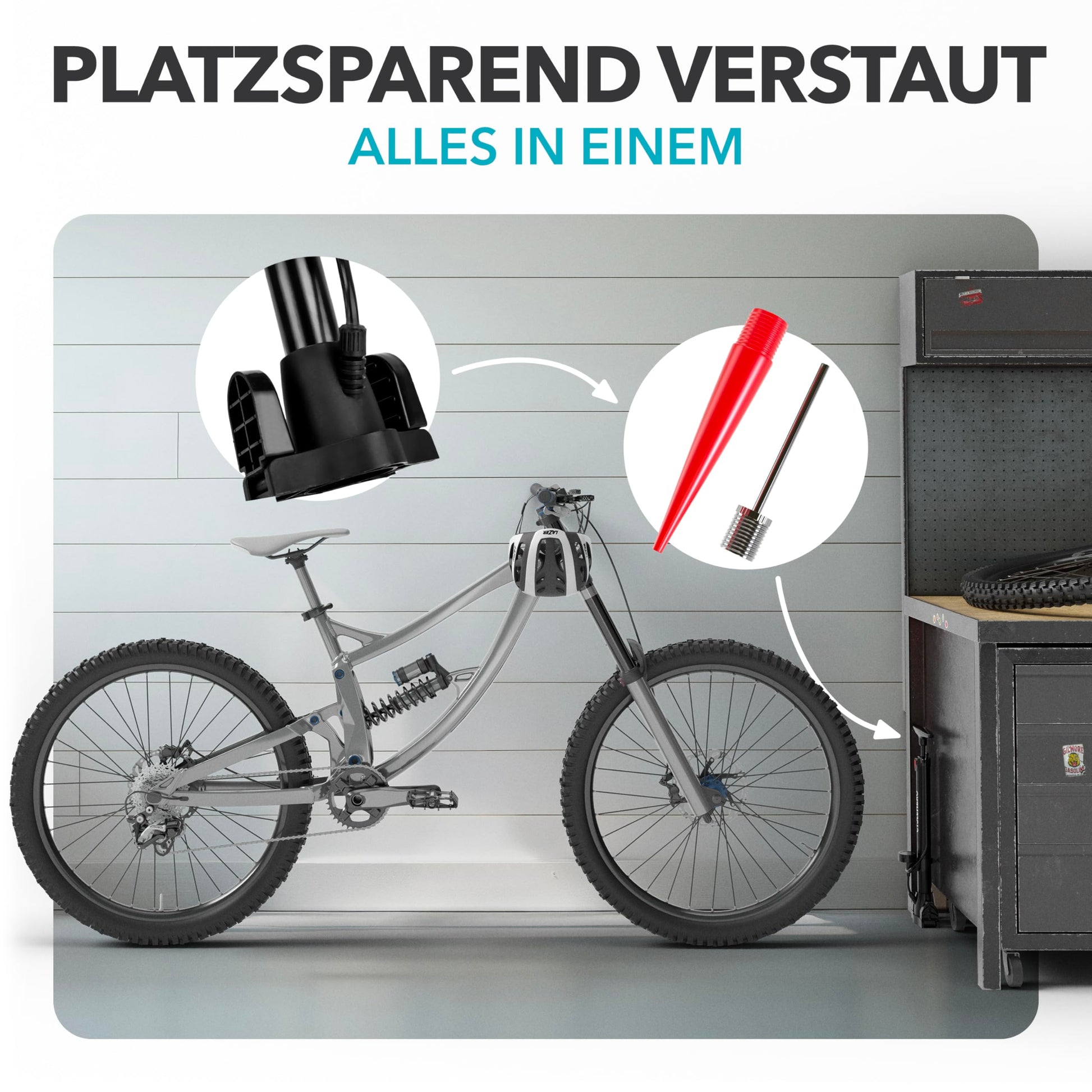 "✅ ABSOLUTELY STABLE: Exclusive comfort with a 25cm wide base & ergonomically shaped 22cm wide handle. Store the flexible 65cm hose & adapter directly on the bike pump.