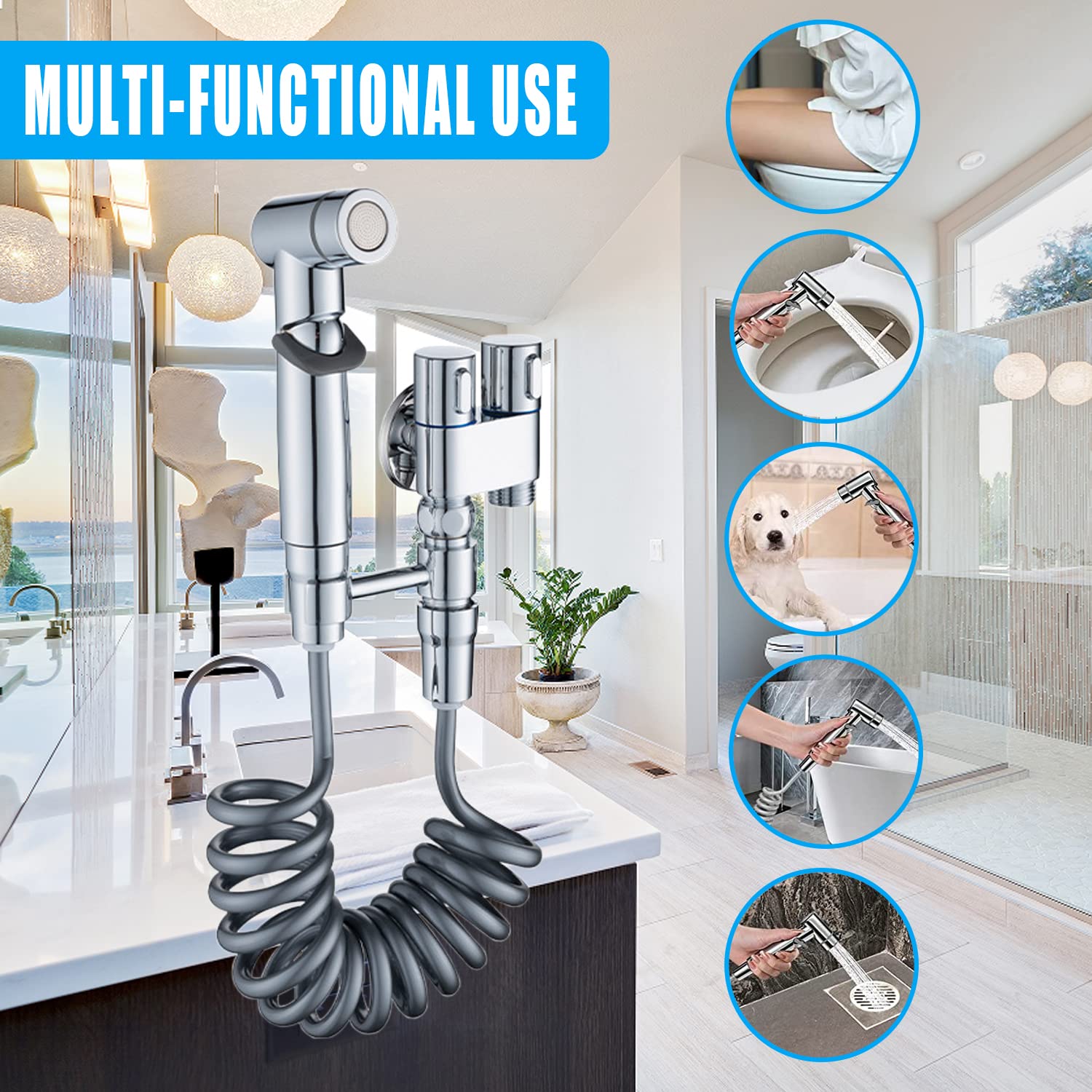 ["【SEPARATE TWO SWITCH 3-WAY VALVE】1/2" MALE Brass 3-Way Valve directly connect to your water supply, with two separate switches you can turn on and off separately to the bidet sprayer and the toilet flush. NOTE: YOU MUST CUT YOUR HOUSE WATER SUPPLY DURING INSTALLATION.","【RETRACTABLE SPRING HOSE】The toilet shower 6.6-foot long hose automatically retracts when not in use, saving space. Compact when retracted, will not drag on the floor, easy to clean. The thickened PU spring tube with large diameter ensures a consistent water flow. Anti-burst and avoids leaks.","【ADJUSTABLE PRESSURE】ALLILUYAA bidet sprayer for toilet is available in hydraulic modes. You can adjust the water pressure gradually through the valve to meet the various cleaning needs for pets, children, and the whole family.","【ECO-DESIGN】ALLILUYAA hand bidet sprayer is the best choice for floor cleaning to improve personal hygiene, especially for women during pregnancy and menstruation. Hand Held Bidet Sprayer's one-hand ergonomic design allows you to clean your front or back easier, which is more hygienic than using toilet paper.","【EASY INSTALLATION】Installation only takes 10 minutes, no tools required, one person can install it. Plus, you don't need to remodel your entire bathroom."]