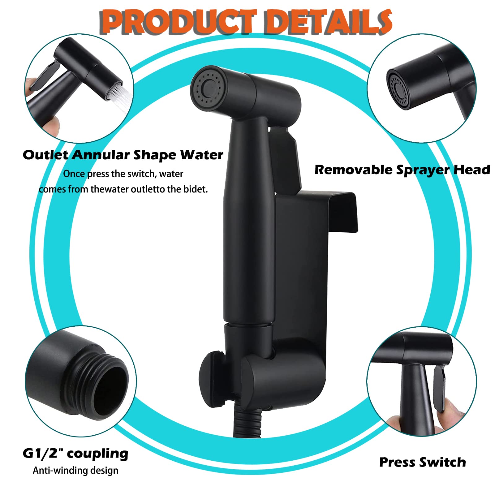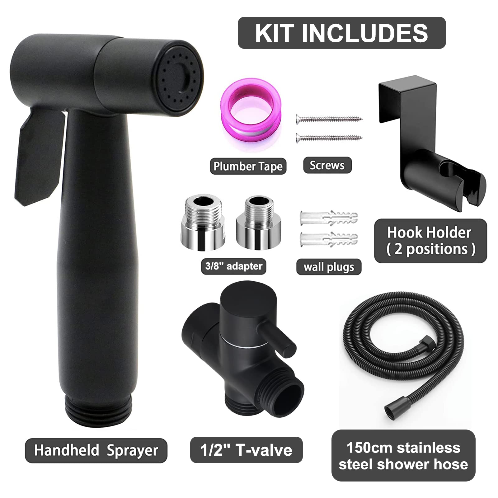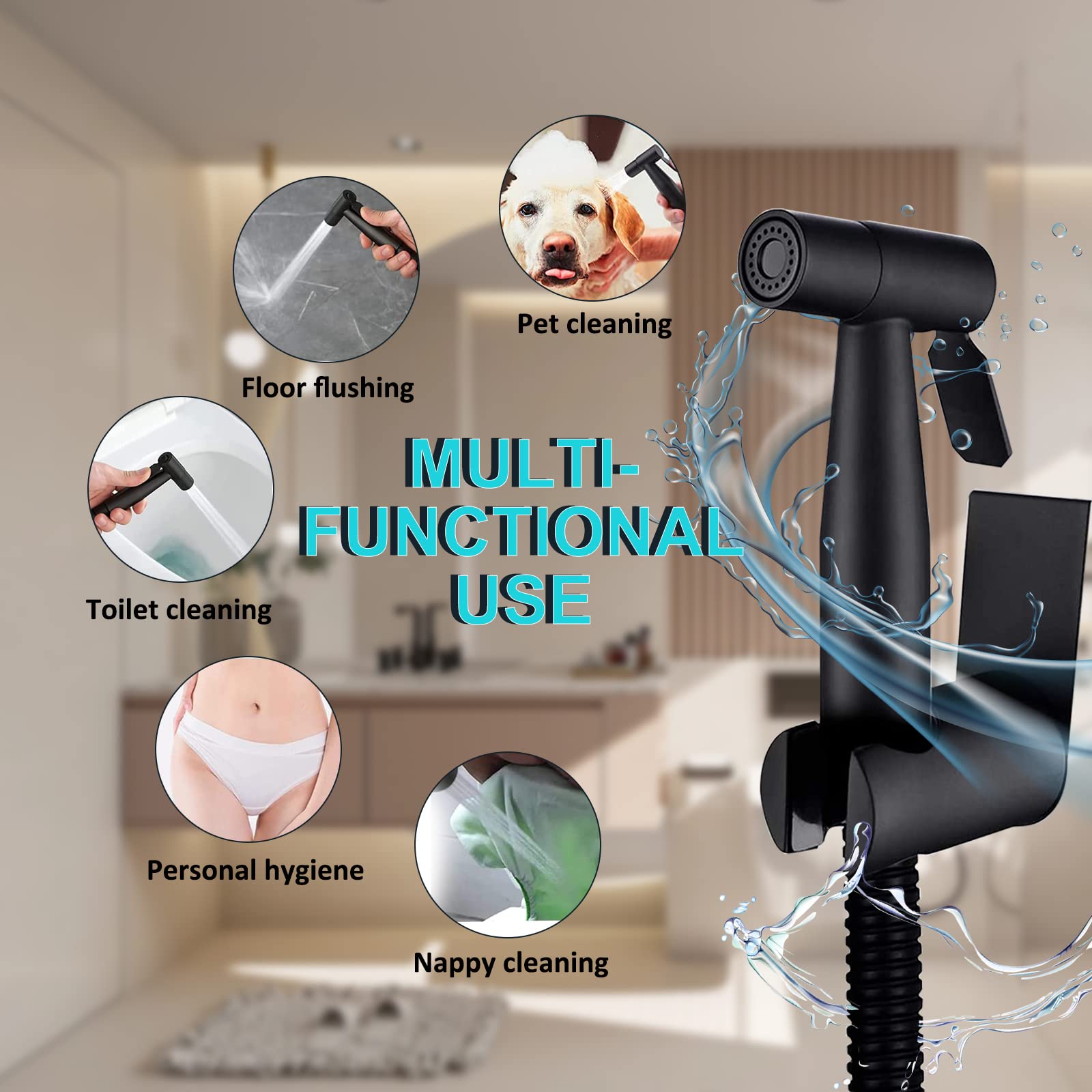 ["Bidet Handheld Sprayer in Stainless Steel. This bidet handheld sprayer can not only help us with personal hygiene, but also bathing pets, cleaning the toilet, and changing clean diapers. In this special time, we should pay special attention to our hygiene","Easy to Install. We provide you with all the accessories you need to install these multifunctional handheld sprayers. You do not need any special bidet handheld skills to install this toilet handheld sprayer. We also provide 1/2\" and 3/8\" adapters, so you can easily switch between G1/2 and 3/8 interfaces","Quality Material. The hose of the bidet handheld sprayer for toilet spray guns is made of stainless steel and has an EPDM inner tube, which reduces the risk of explosions. This improves the durability of the product and avoids leakage problems. This bidet spray set is characterized by excellent quality and durability. You don't have to worry about scratches, corrosion, or leaks","Reduced Environmental Pollution. This bidet handheld sprayer set provides a pleasant cleaning feeling that is not only more hygienic, but also gentler on your skin. The operation is smooth and prevents the faucet from dripping. It ensures a stable water flow and effective cleaning power. This saves water and reduces environmental impact","Package Includes: High-quality Bidet Hand Sprayers, 59-inch Stainless Steel Bidet Hose, Brass T-Adapter Valve, G3/8 Screw Interfaces, Stainless Steel Bidet Holder, Stainless Steel Bidet Holder Hook, Accessory Set."]